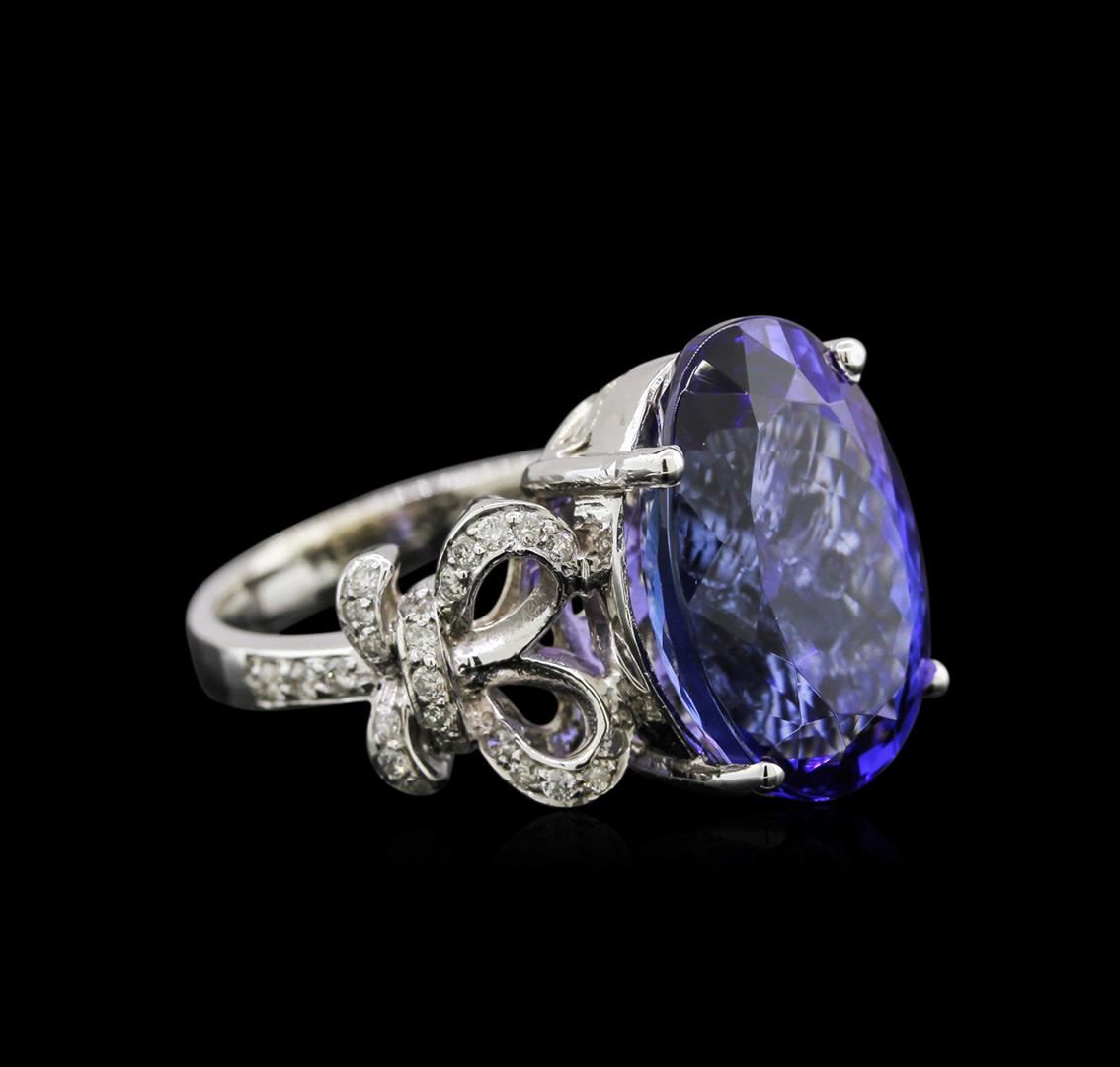 One electronically tested 14KT white gold lady's cast fashion ring with a cathedral shank with a bright polish finish. The featured ring has a 3.00mm shank. Identified with markings of "K14". Condition is new, good workmanship. Containing: One prong set oval modified brilliant cut natural tanzanite, measuring 16.65 x 11.40 x 8.40mm, 10% bulge factor, approximate weight of 12.47ct., clarity is eye clean, type I, dark, very slightly grayish, violet color, (GIA V 7/3), cut is very good. Transmitting light with no distortion, transparent. Colored gemstones are presumed to have been subjected to commonly used enhancement processes. Graded in the setting. Forty-Eight bead set round brilliant cut diamonds, measuring 1.30 - 1.25 x 0.77mm (depth est.) approximate total weight of 48 Stones = 0.37ct. Graded in the setting. Clarity: SI-1 to I-1. Color: H - I. Cut Good. Total Weight of Colored Stones 12.47ct. Total Weight of Diamonds 0.37ct. Total Weight of Ring 9.40gm. GAS Appraised at $29,490.00.