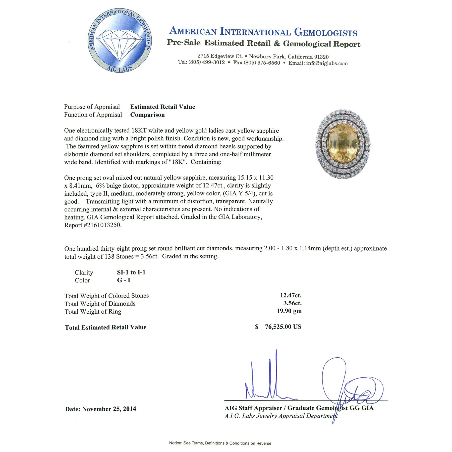 One electronically tested 18KT white and yellow gold ladies cast yellow sapphire and diamond ring with a bright polish finish. The featured yellow sapphire is set within tiered diamond bezels supported by elaborate diamond set shoulders, completed by a three and one-half millimeter wide band. Identified with markings of "18K". Condition is new, good workmanship. Containing: One prong set oval mixed cut natural yellow sapphire, measuring 15.15 x 11.30 x 8.41mm, 6%. bulge factor, approximate weight of 12.47ct., clarity is slightly included, type II, medium, moderately strong, yellow color, (GIA Y 5/4), cut is good. Transmitting light with a minimum of distortion, transparent. Naturally occurring internal & external characteristics are present. No indications of heating. GIA Gemological Report attached. Graded in the GIA Laboratory, Report #2161013250.One Hundred Thirty-Eight prong set round brilliant cut diamonds, measuring 2.00 - 1.80 x 1.14mm (depth est.) approximate total weight of 138 Stones = 3.56ct. Graded in the setting. Clarity: SI-1 to I-1. Color: G - I. Total Weight of Colored Stones 12.47ct. Total Weight of Diamonds 3.56ct. Total Weight of Ring 19.90 grams. AIG Appraised at $76,525.00.