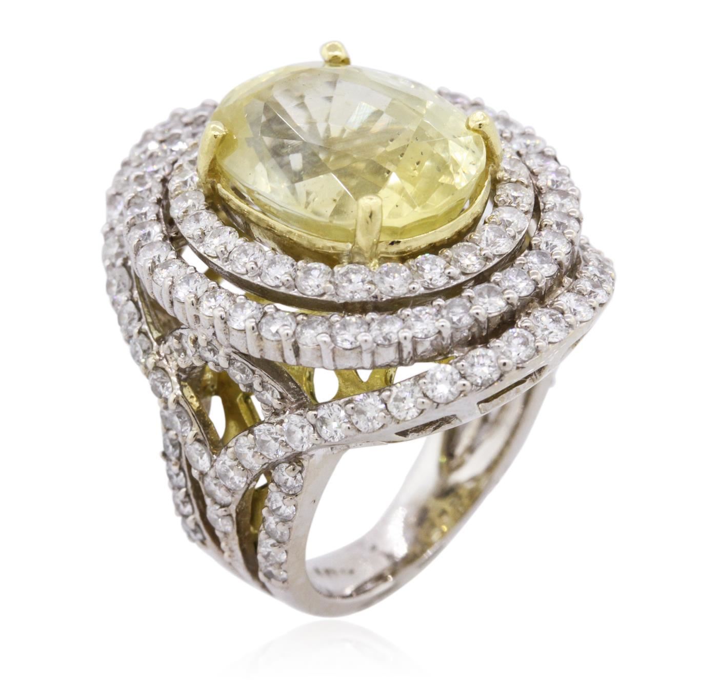 One electronically tested 18KT white and yellow gold ladies cast yellow sapphire and diamond ring with a bright polish finish. The featured yellow sapphire is set within tiered diamond bezels supported by elaborate diamond set shoulders, completed by a three and one-half millimeter wide band. Identified with markings of "18K". Condition is new, good workmanship. Containing: One prong set oval mixed cut natural yellow sapphire, measuring 15.15 x 11.30 x 8.41mm, 6%. bulge factor, approximate weight of 12.47ct., clarity is slightly included, type II, medium, moderately strong, yellow color, (GIA Y 5/4), cut is good. Transmitting light with a minimum of distortion, transparent. Naturally occurring internal & external characteristics are present. No indications of heating. GIA Gemological Report attached. Graded in the GIA Laboratory, Report #2161013250.One Hundred Thirty-Eight prong set round brilliant cut diamonds, measuring 2.00 - 1.80 x 1.14mm (depth est.) approximate total weight of 138 Stones = 3.56ct. Graded in the setting. Clarity: SI-1 to I-1. Color: G - I. Total Weight of Colored Stones 12.47ct. Total Weight of Diamonds 3.56ct. Total Weight of Ring 19.90 grams. AIG Appraised at $76,525.00.