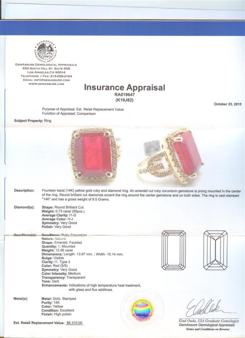 Fourteen karat (14K) yellow gold ruby and diamond ring. An emerald cut ruby corundum gemstone is prong mounted in the center of the ring. Round brilliant cut diamonds accent the ring around the center gemstone and on both sides. The ring is cast stamped "14K" and has a gross weight of 9.5 Grams. Diamond(s): Shape: Round Brilliant Cut. Weight: 0.73 carat (55pcs). Average Clarity: I1-I2. Average Color: H-J. Symmetry: Very Good. Polish: Very Good. GemStone(s): Ruby Corundum. Nature: Natural. Shape: Emerald, Faceted. Quantity: 1, Mounted. Weight: 12.48 carat. Dimensions: Length- 13.97 mm. ; Width 10.14 mm. Bulge: Visible. Clarity: I1, Type 3. Color: Red (5/5). Symmetry: Very Good. Color Intensity: Medium. Transparency: Transparent. Tone: Dark. Enhancements: Indications of high temperature heat treatment, with glass and flux additives. Metal(s): Metal: Gold, Stamped. Purity: 14K. Color: Yellow. Condition: Excellent. Finish: High polish. GGA Appraised at $6,310.00.