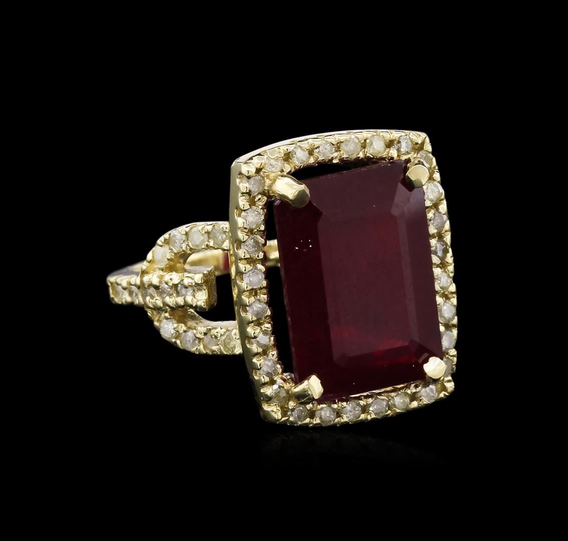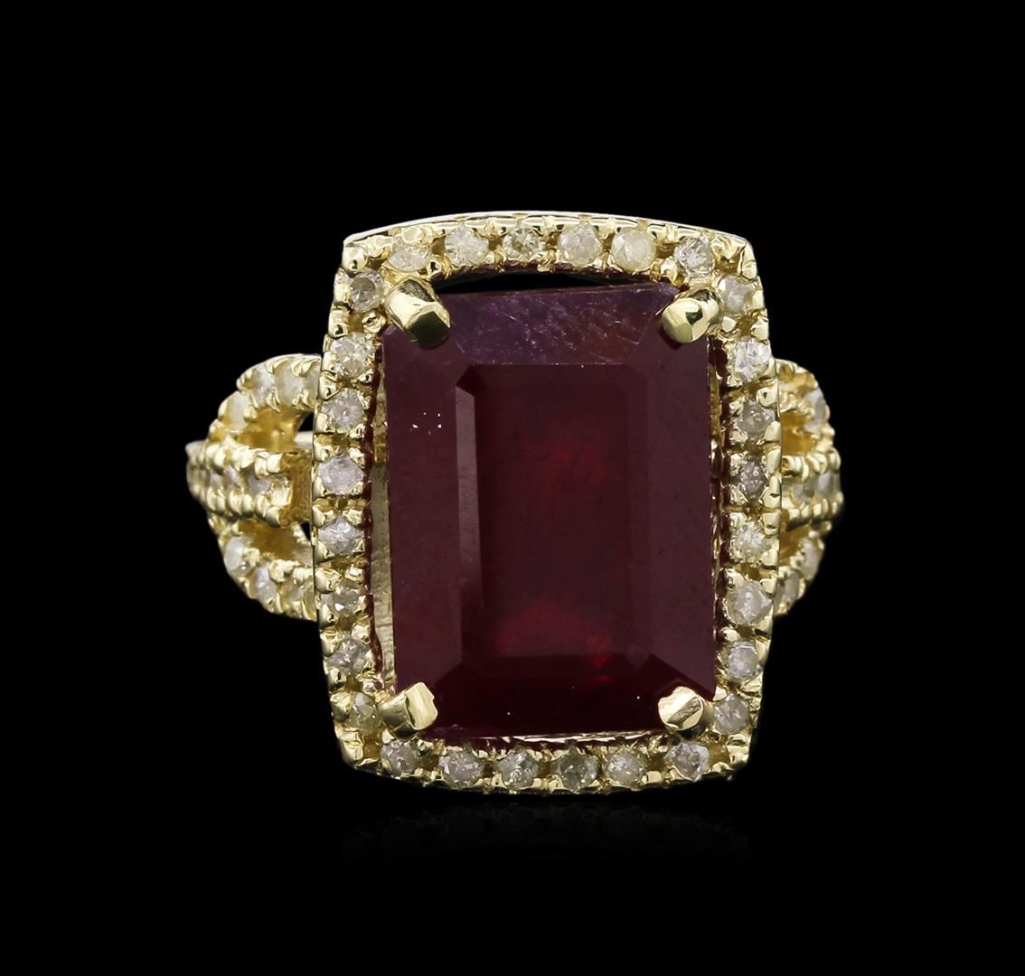 Fourteen karat (14K) yellow gold ruby and diamond ring. An emerald cut ruby corundum gemstone is prong mounted in the center of the ring. Round brilliant cut diamonds accent the ring around the center gemstone and on both sides. The ring is cast stamped "14K" and has a gross weight of 9.5 Grams. Diamond(s): Shape: Round Brilliant Cut. Weight: 0.73 carat (55pcs). Average Clarity: I1-I2. Average Color: H-J. Symmetry: Very Good. Polish: Very Good. GemStone(s): Ruby Corundum. Nature: Natural. Shape: Emerald, Faceted. Quantity: 1, Mounted. Weight: 12.48 carat. Dimensions: Length- 13.97 mm. ; Width 10.14 mm. Bulge: Visible. Clarity: I1, Type 3. Color: Red (5/5). Symmetry: Very Good. Color Intensity: Medium. Transparency: Transparent. Tone: Dark. Enhancements: Indications of high temperature heat treatment, with glass and flux additives. Metal(s): Metal: Gold, Stamped. Purity: 14K. Color: Yellow. Condition: Excellent. Finish: High polish. GGA Appraised at $6,310.00.