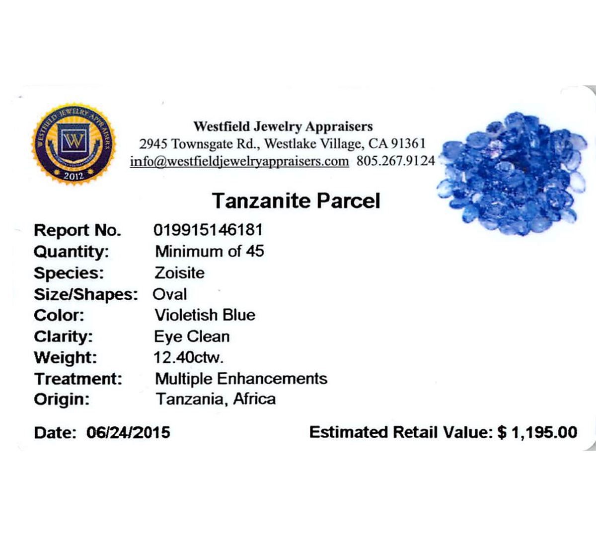 Forty-five oval mixed cut natural tanzanites, measuring 4.00 x 3.00 x 2.00mm, exact total weight 12.40ct., clarity is slightly included, type I, medium dark, very slightly grayish, violetish blue color, (GIA vB 6/3), cut is good. Measurements & the color grade are an average for the group, Color grade is an average for the group, Transmitting light with no distortion, transparent, Naturally occurring internal & external characteristics are present, Indications of multiple laboratory enhancements, including high temperature heat treatment. Westfield Appraised at $1,195.00.