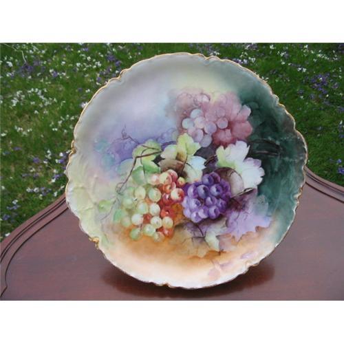 HERE IS A STUNNINGLY BEAUTIFUL HAND PAINTED ARTIST SIGNED HAVILAND LIMOGES CHARGER. IT FEATURES GORGEOUS CLUSTERS OF GRAPES AGAINST A CREAMY BACKGROUND OF VARYING SHADES OF LAVENDAR, PEACH AND GREEN. IT IS SIGNED BY B. BELLOWS AND DATED 1902. NO CHIPS, CRACKS, HAIRLINES OR REPAIRS. SPONGE GOLDWEAR APPLIED WITH MINOR WEAR. SOME VERY MINOR PAINTWEAR ON ONE CORNER.