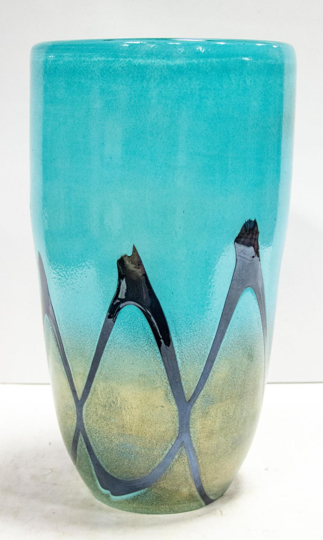 12.5 INCH TALL BLUE AND BLACK ART GLASS VASE