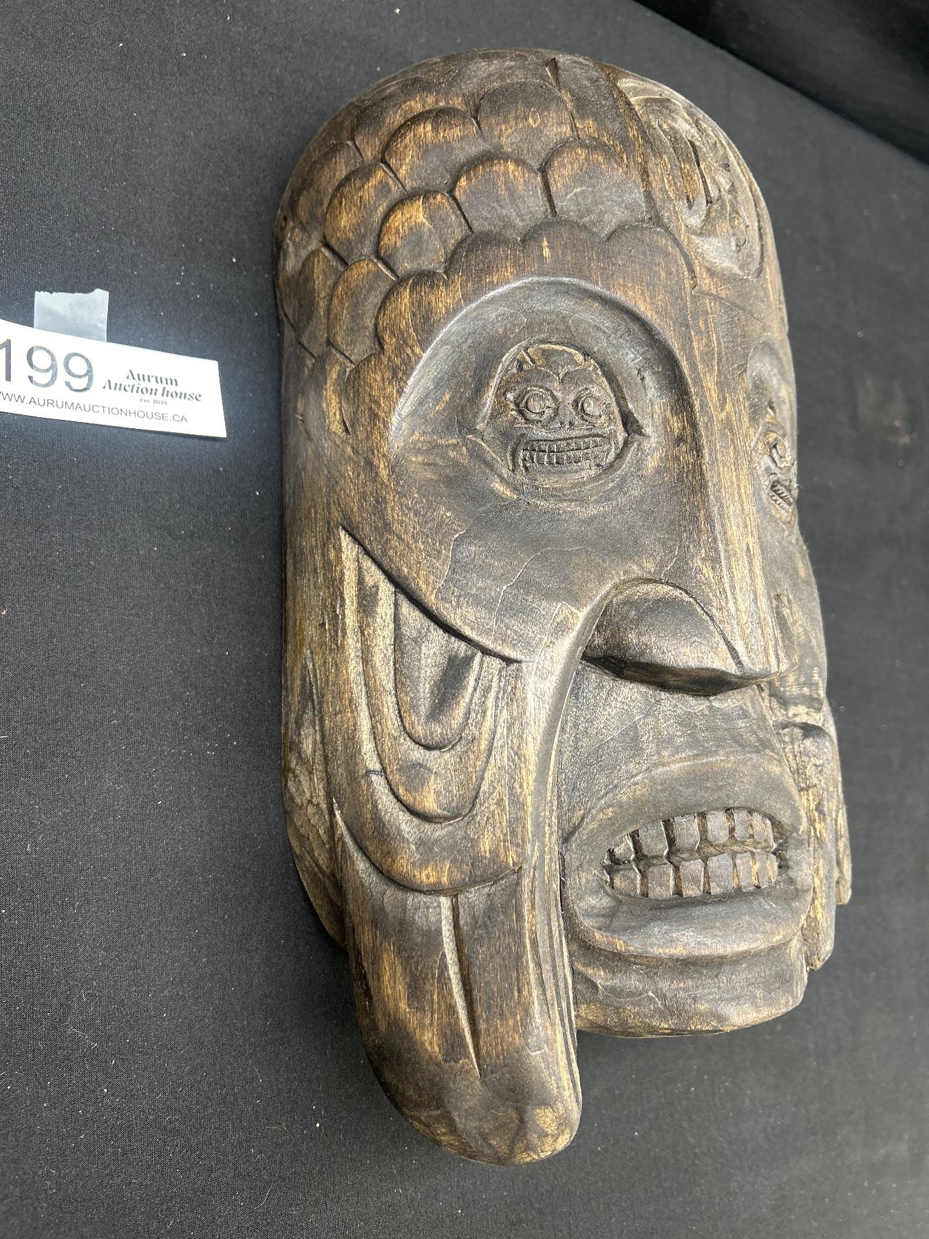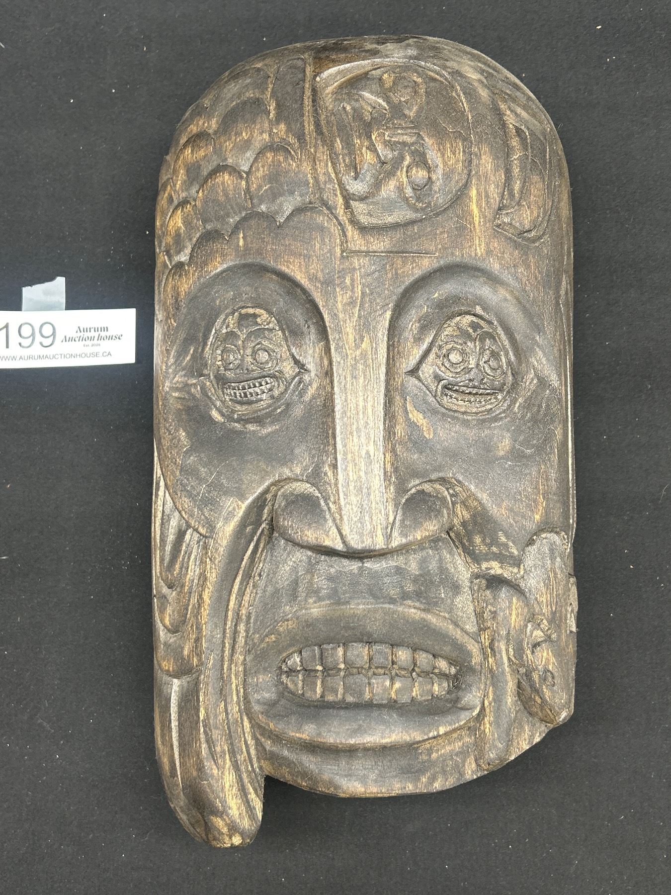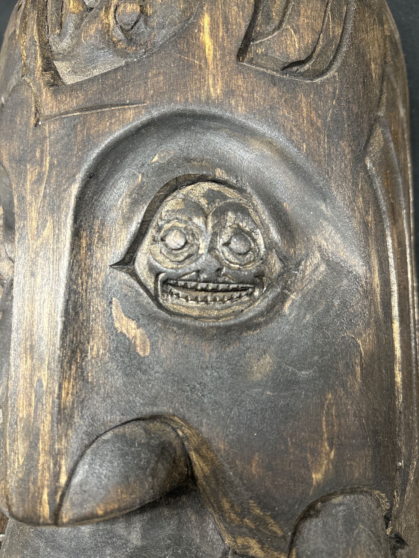 12.5" Talll Carved West Coast Native Mask Lots of Detail with Faces Carved in the Eyes Etc.