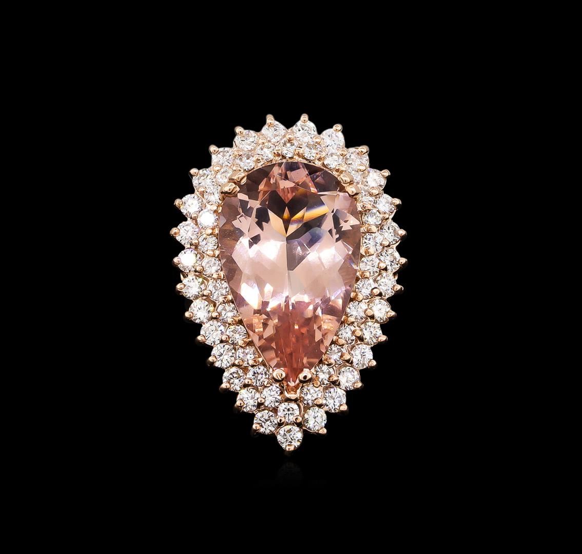 One electronically tested 14KT rose gold lady's cast fashion ring with a double basket halo with a bright polish finish. The featured lady's ring has a shank measuring 3.44 millimeters wide. Identified with markings of "K14". Condition is new, good workmanship. Containing: One prong set pear modified brilliant cut natural morganite, measuring 22.06 x 13.79 x 8.27mm, approximate weight of 12.50ct., clarity is eye clean, type I, light, very slightly brownish, orangy red color, (GIA oR 3/3), cut is very good. Transmitting light with no distortion, transparent. Colored gemstones are presumed to have been subjected to commonly used enhancement processes. Graded in the setting. Twenty-Nine prong set round brilliant cut diamonds, measuring 2.40 - 2.30 x 1.41mm (depth est.) approximate total weight of 29 Stones = 1.38ct. Graded in the setting. Clarity: VS-2 to SI-2. Color: H - I. Cut Good Twenty-Eight prong set round brilliant cut diamonds, measuring 2.10 - 2.00 x 1.25mm (depth est.) approximate total weight of 28 Stones = 0.90ct. Graded in the setting. Clarity: VS-2 to SI-2. Color: H - I. Cut Good. Total Weight of Colored Stones 12.50ct. Total Weight of Diamonds 2.28ct. Total Weight of Ring 14.90gm. GAS Appraised at $13,305.00.