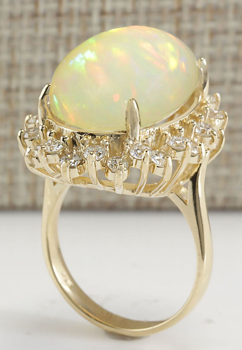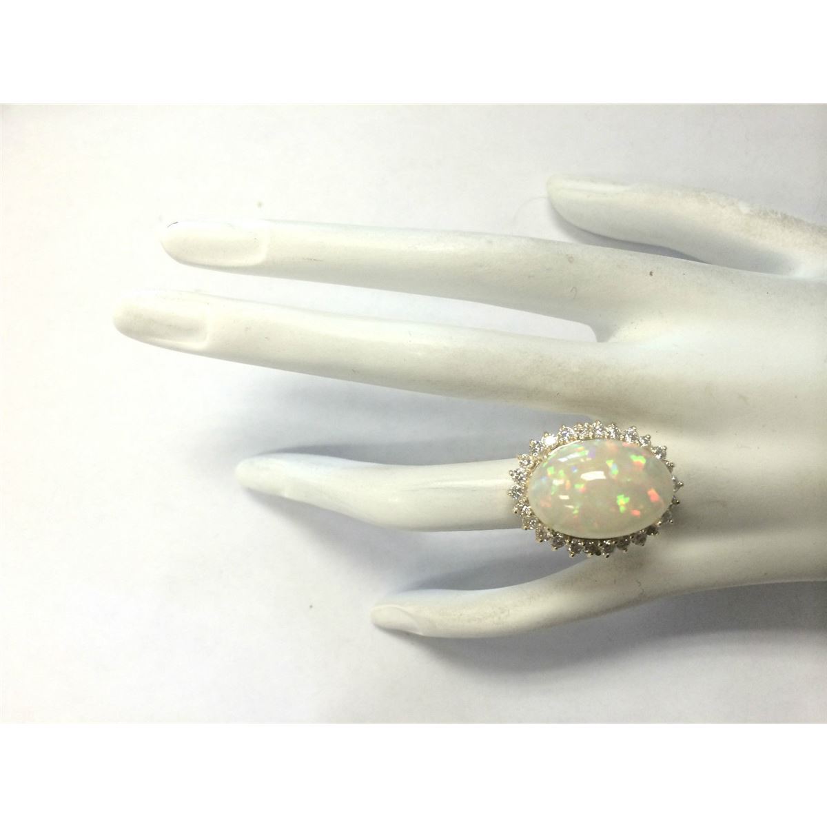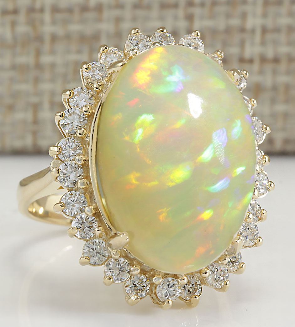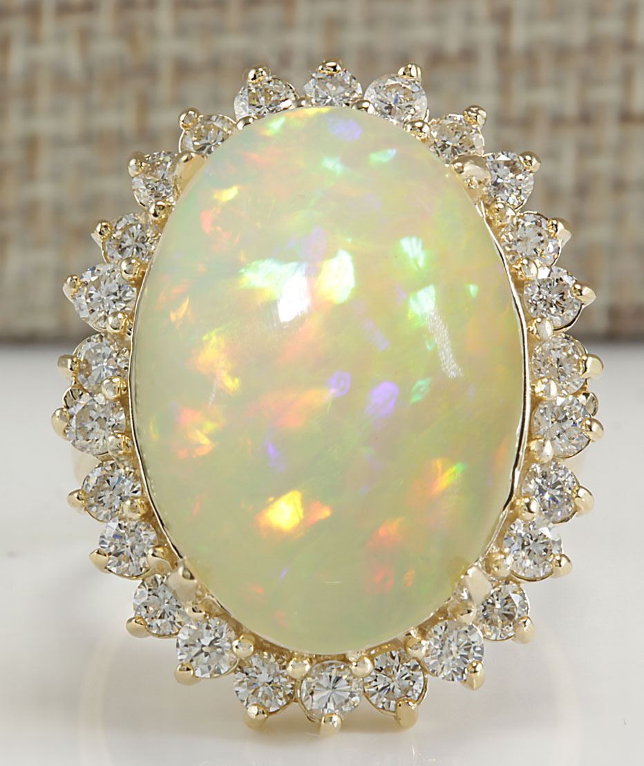 Stamped: 14K Ring Size: 6.75 Total Ring Weight: 9.2 Grams Diamond Weight: Total natural diamond weight is 1.23carat. SI1-SI2 clarity / G-H color Gemstone Weight: Total Natural Ethiopian Opal Weight is 11.28ctw (Measures: 20.15x13.93mm) Face Measures: 25.33x20.46mm Main stone color: Multicolor [SKU:703089]