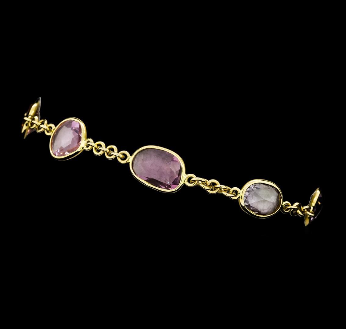 One electronically tested 18KT yellow gold lady's combination cast & assembled fashion bracelet with a spring ring clasp with a bright polish finish. The featured lady's bracelet can be worn between seven and seven and a half inches in length. Condition is new, good workmanship. Containing: Eight bezel set faceted slice cut natural multi-color sapphires, measuring 10.00 x 5.00 x 0.00mm, (depth est.) approximate total weight of 12.52ct., clarity is eye clean, cut is good. The featured sapphires have been cut into faceted freeform oval slices and range in color from very light pink to very light purplish pink. Transmitting light with no distortion, transparent. Colored gemstones are presumed to have been subjected to commonly used enhancement processes. Graded in the setting. Total Weight of Colored Stones 12.52ct.. Total Weight of Bracelet 6.60gm GAS Appraised at $5830.00. GAS Appraised at $5,830.00.