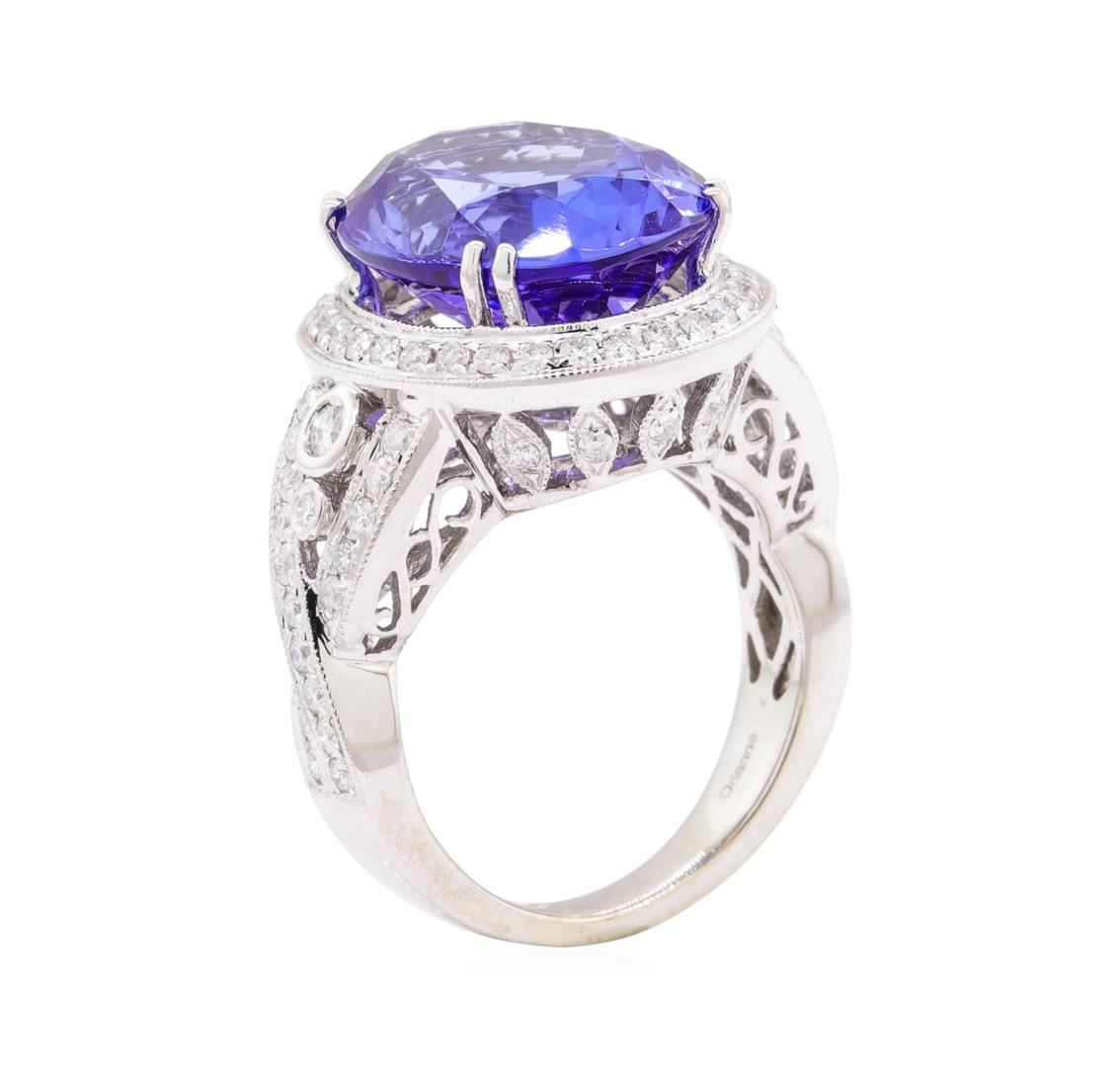 One electronically tested 14KT white gold lady's cast fashion ring with a cathedral halo with a bright polish with milgrain detailing finish. The featured lady's ring has a shank measuring 3.30 millimeters wide. Trademark is Orianne. Identified with markings of '14K'. Condition is new, good workmanship. Containing: One prong set oval modified brilliant cut natural tanzanite, measuring 16.13 x 13.20 x 8.22mm, (depth est.) approximate weight of 12.45ct., clarity is eye clean, medium dark, strong, bluish violet color, (GIA bV 6/5), cut is very good. Colored gemstones are presumed to have been subjected to commonly used enhancement processes. Graded loose prior to setting in the GIA Laboratory, Report #5171951743. Two bezel set round brilliant cut diamonds, measuring 2.20 - 2.15 x 1.35mm (depth est.) approximate total weight of 2 Stones = 0.08ct. Graded in the setting. Color H - I Clarity SI-1 to SI-2 Cut Good Sixty-Eight prong set round brilliant cut diamonds, measuring 1.45 - 1.40 x 0.89mm (depth est.) approximate total weight of 68 Stones = 0.75ct. Graded in the setting. Color H - I Clarity SI-2 to I-1 Cut Good Ten prong set round brilliant cut diamonds, measuring 1.40 - 1.35 x 0.86mm (depth est.) approximate total weight of 10 Stones = 0.10ct. Graded in the setting. Color H - I Clarity SI-2 to I-1 Cut Good. Total Weight of Colored Stones 12.45ct.. Total Weight of Diamonds 0.93ct.. Total Weight of Ring 11.00gm GAS Appraised at $20220.00. GAS Appraised at $20,220.00.