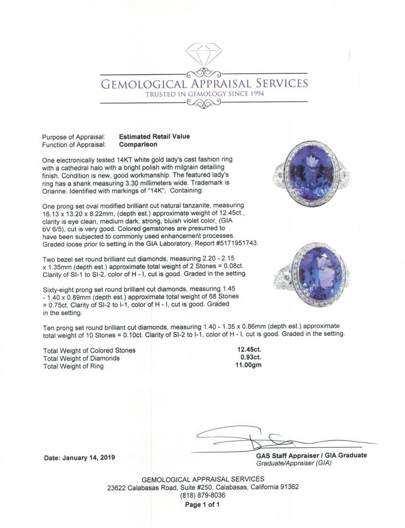 One electronically tested 14KT white gold lady's cast fashion ring with a cathedral halo with a bright polish with milgrain detailing finish. The featured lady's ring has a shank measuring 3.30 millimeters wide. Trademark is Orianne. Identified with markings of '14K'. Condition is new, good workmanship. Containing: One prong set oval modified brilliant cut natural tanzanite, measuring 16.13 x 13.20 x 8.22mm, (depth est.) approximate weight of 12.45ct., clarity is eye clean, medium dark, strong, bluish violet color, (GIA bV 6/5), cut is very good. Colored gemstones are presumed to have been subjected to commonly used enhancement processes. Graded loose prior to setting in the GIA Laboratory, Report #5171951743. Two bezel set round brilliant cut diamonds, measuring 2.20 - 2.15 x 1.35mm (depth est.) approximate total weight of 2 Stones = 0.08ct. Graded in the setting. Color H - I Clarity SI-1 to SI-2 Cut Good Sixty-Eight prong set round brilliant cut diamonds, measuring 1.45 - 1.40 x 0.89mm (depth est.) approximate total weight of 68 Stones = 0.75ct. Graded in the setting. Color H - I Clarity SI-2 to I-1 Cut Good Ten prong set round brilliant cut diamonds, measuring 1.40 - 1.35 x 0.86mm (depth est.) approximate total weight of 10 Stones = 0.10ct. Graded in the setting. Color H - I Clarity SI-2 to I-1 Cut Good. Total Weight of Colored Stones 12.45ct.. Total Weight of Diamonds 0.93ct.. Total Weight of Ring 11.00gm GAS Appraised at $20220.00. GAS Appraised at $20,220.00.