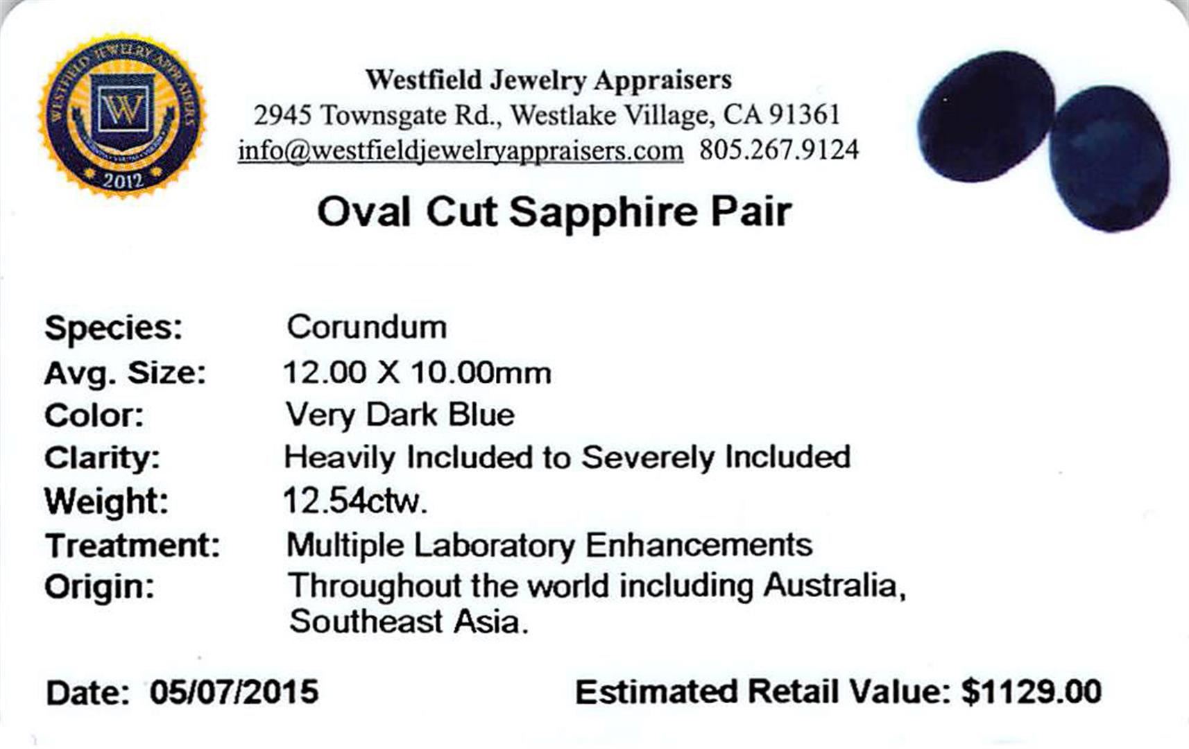 Two oval cut sapphires, measuring 12.00 x 10.00mm, approximate total weight of 12.54ct., clarity is heavily included to severely included, very dark blue color. Indications of multiple laboratory enhancements. Westfield Appraised at $1,129.00.