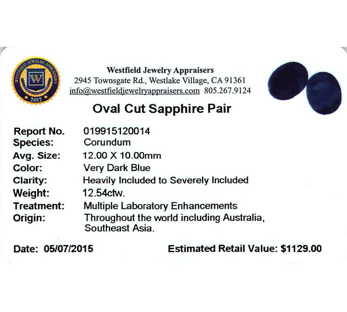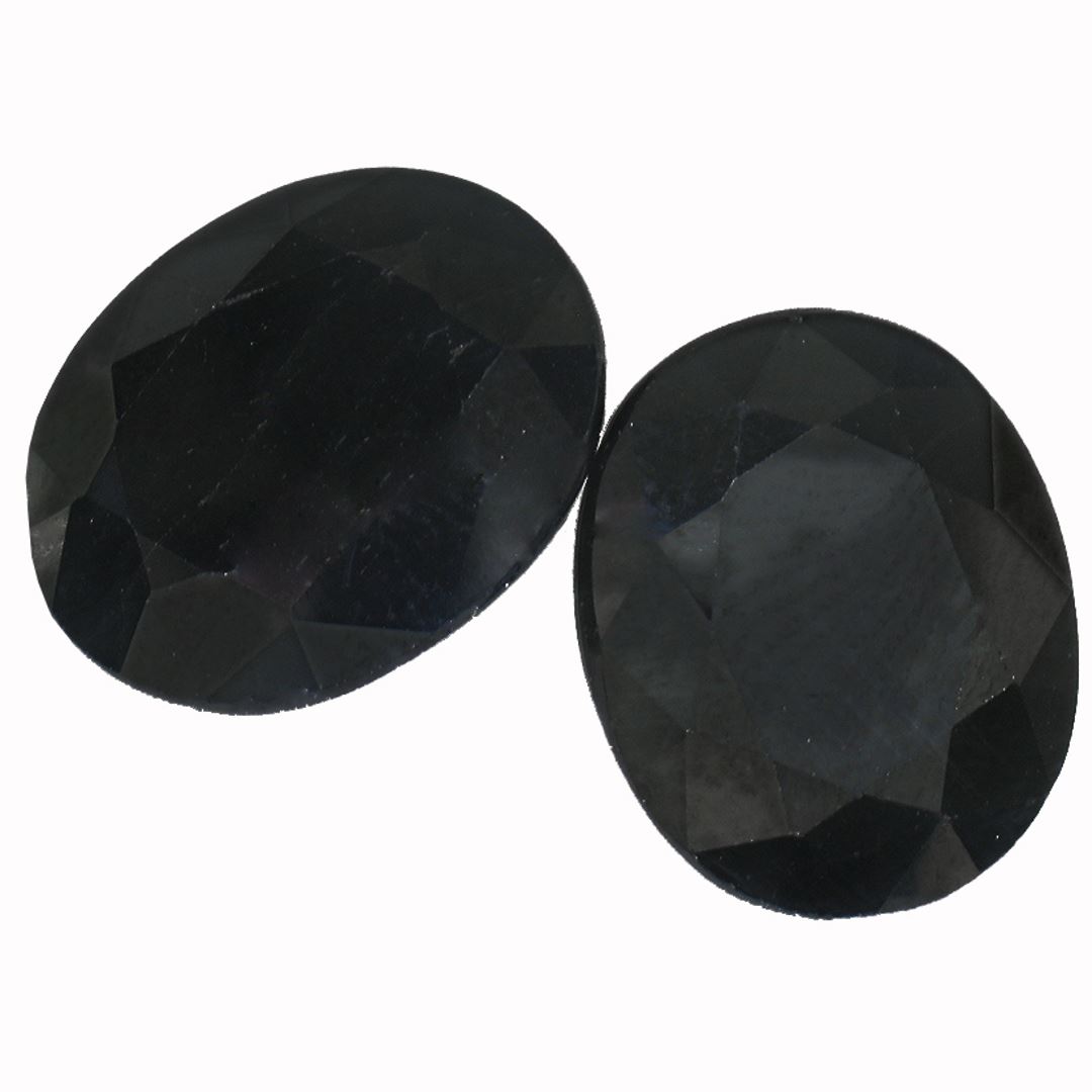 Two oval cut sapphires, measuring 12.00 x 10.00mm, approximate total weight of 12.54ct., clarity is heavily included to severely included, very dark blue color. Indications of multiple laboratory enhancements. Westfield Appraised at $1,129.00.