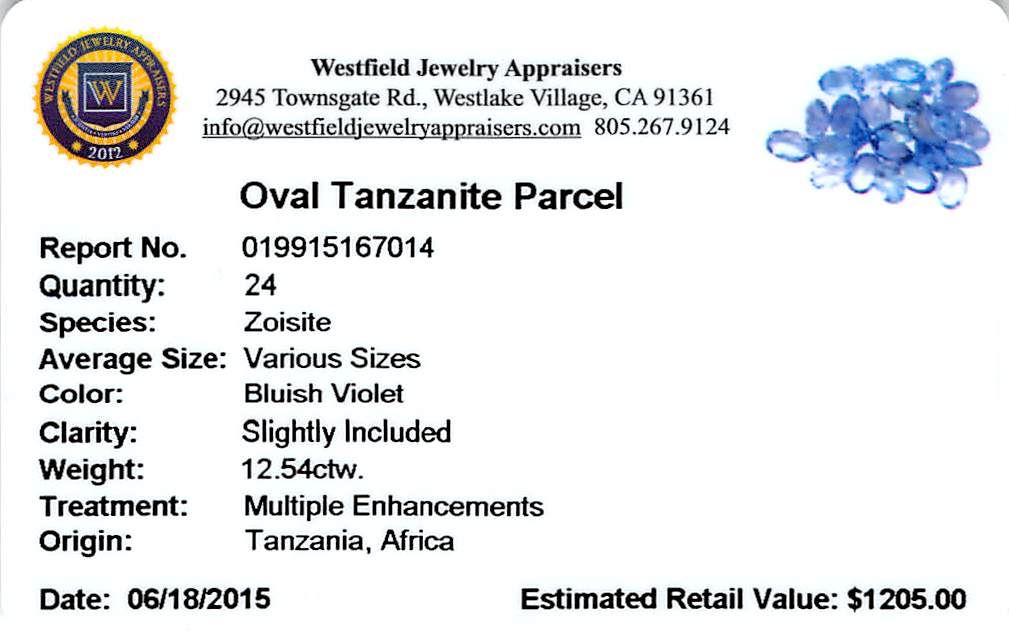 Twenty-four oval mixed cut natural tanzanites exact total weight 12.54ct., clarity is slightly included, type I, medium dark, very slightly grayish, bluish violet color, (GIA bV 6/3), cut is good. Transmitting light with a minimum of distortion, transparent. Naturally occurring internal & external characteristics are present. Color grade is an average for the group. Tanzanite is a very rare gemstone that is only found in the country of Tanzania. Originally discovered in 1967. Tiffany & Company, named the stone Tanzanite. It is found in the Usumburu Mountains that border the Umba Valley of northern Tanzania. Tanzanite occurs in gray, brown, violet, blue, reddish-purple, & green. The gem is interesting because of its exceptional pleochroism. Rotated in different directions a tanzanite will exhibit multiple changes of color. Tanzanite has a low tolerance to ultrasonic cleaning, and should not be cleaned using this method. Westfield Appraised at $1,205.00.