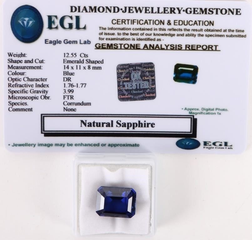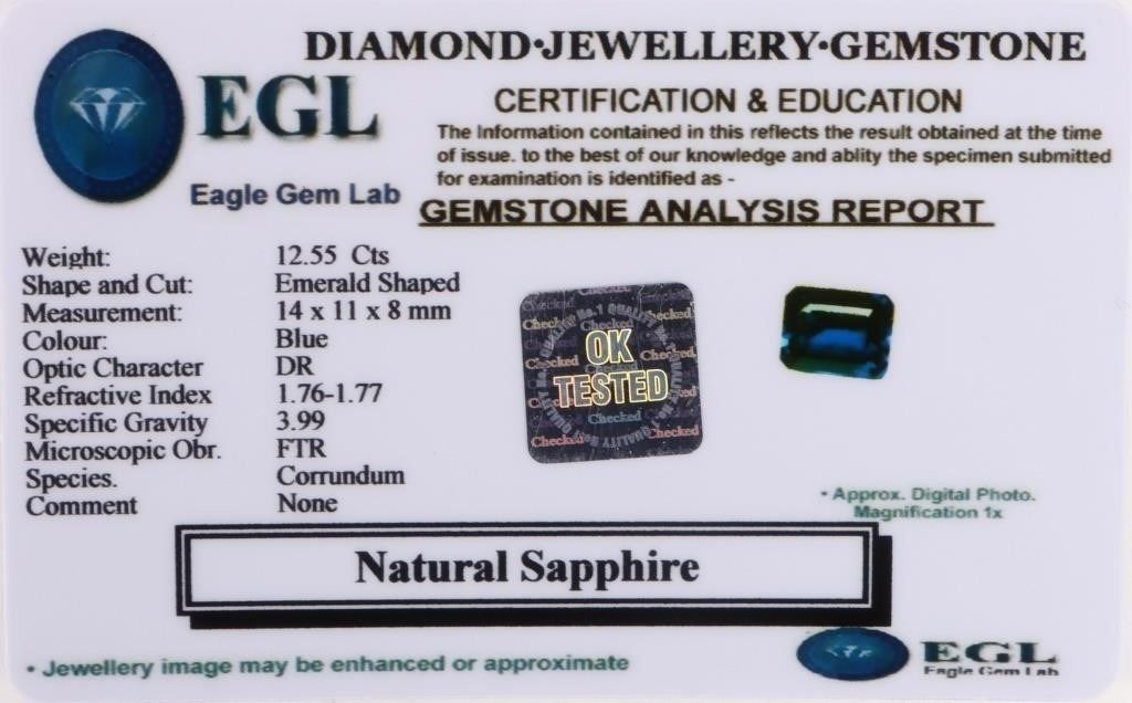 12.55ct emerald cut blue sapphire EGL certified 14mm X 11mm X 8mm.