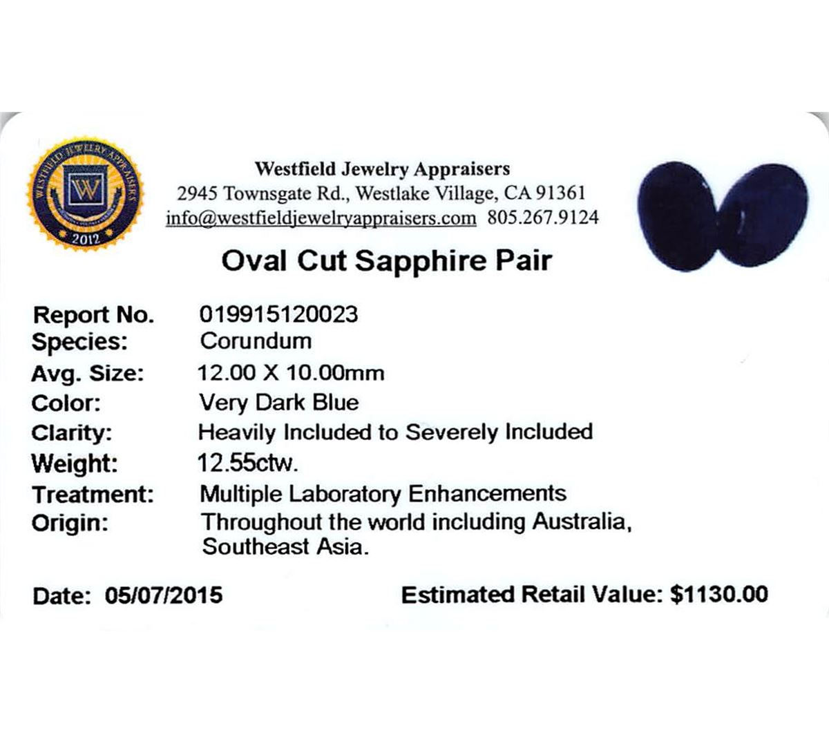 Two oval cut sapphires, measuring 12.00 x 10.00mm, approximate total weight of 12.55ct., clarity is heavily included to severely included, very dark blue color. Indications of multiple laboratory enhancements. Westfield Appraised at $1,130.00.