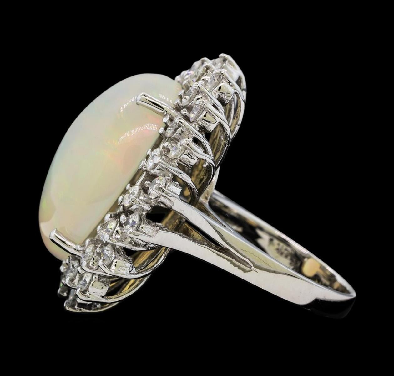 One electronically tested 14KT white gold lady's cast fashion ring with a staggered basket halo with a bright polish finish. The featured lady's ring has a shank measuring 2.58 millimeters wide. Identified with markings of '14K'. Condition is new, good workmanship. Containing: One crystal opal that is cut in a oval shaped cabochon and is prong set, measuring 20.56 mm long x 16.62 mm wide, and 7.51 mm thick and the approximate weight is 12.57 carats. The opal has a somewhat bright, red multicolor play of color (fire) in a rolling flashfire pattern; a medium dome; a good cut; no inclusions; minor dull spot in its brightness and pattern; and is slightly directional. Graded in the setting. Thirty-Six prong set round brilliant cut diamonds, measuring 2.40 - 2.35 x 1.45mm (depth est.) approximate total weight of 36 Stones = 1.82ct. Graded in the setting. Clarity SI-1 to I-1. Color: G - H Cut Good. Total Weight of Diamonds 1.82ct.. Total Weight of Opals 12.57ct.. Total Weight of Ring 13.20gm. GAS Appraised.