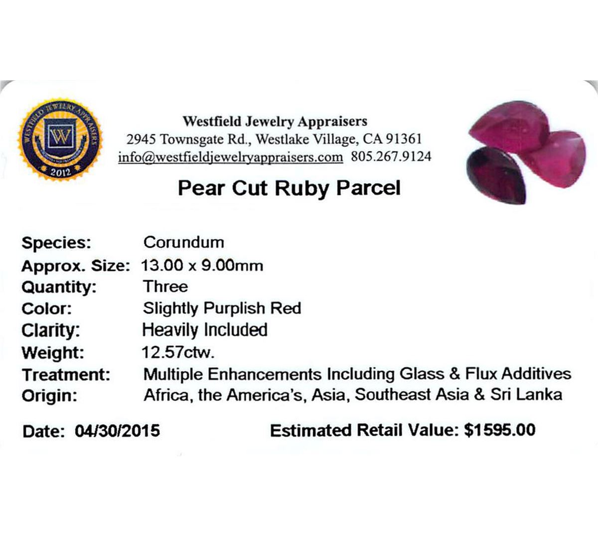 Three pear mixed cut natural rubies exact total weight 12.57ct., clarity is heavily included, type II, dark, very slightly brownish, slightly purplish red color, (GIA slpR 7/3), cut is good. Westfield Appraised at $1,595.00.