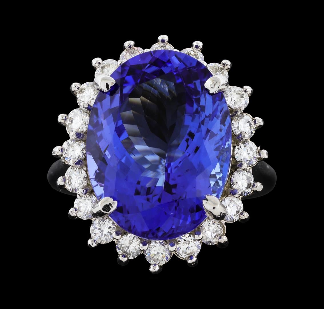 One electronically tested 14KT white gold lady's cast fashion ring with a cathedral shank with a basket halo with a bright polish finish. The featured lady's ring has a shank measuring 2.09 millimeters wide. Identified with markings of '14K'. Condition is new, good workmanship. Containing: One prong set oval modified brilliant cut natural tanzanite, measuring 16.92 x 12.67 x 8.28mm, (depth est.) approximate weight of 12.58ct., clarity is eye clean, medium, moderately strong, violetish blue color, (GIA vB 5/4), cut is very good. Transmitting light with no distortion, transparent. Colored gemstones are presumed to have been subjected to commonly used enhancement processes. Graded in the setting. Twenty prong set round brilliant cut diamonds, measuring 2.40 - 2.30 x 1.46mm (depth est.) approximate total weight of 20 Stones = 0.98ct. Graded in the setting. Clarity SI-1 to SI-2. Color: H - I Cut Good. Total Weight of Colored Stones 12.58ct.. Total Weight of Diamonds 0.98ct.. Total Weight of Ring 9.10gm. GAS Appraised at $21,200.00.