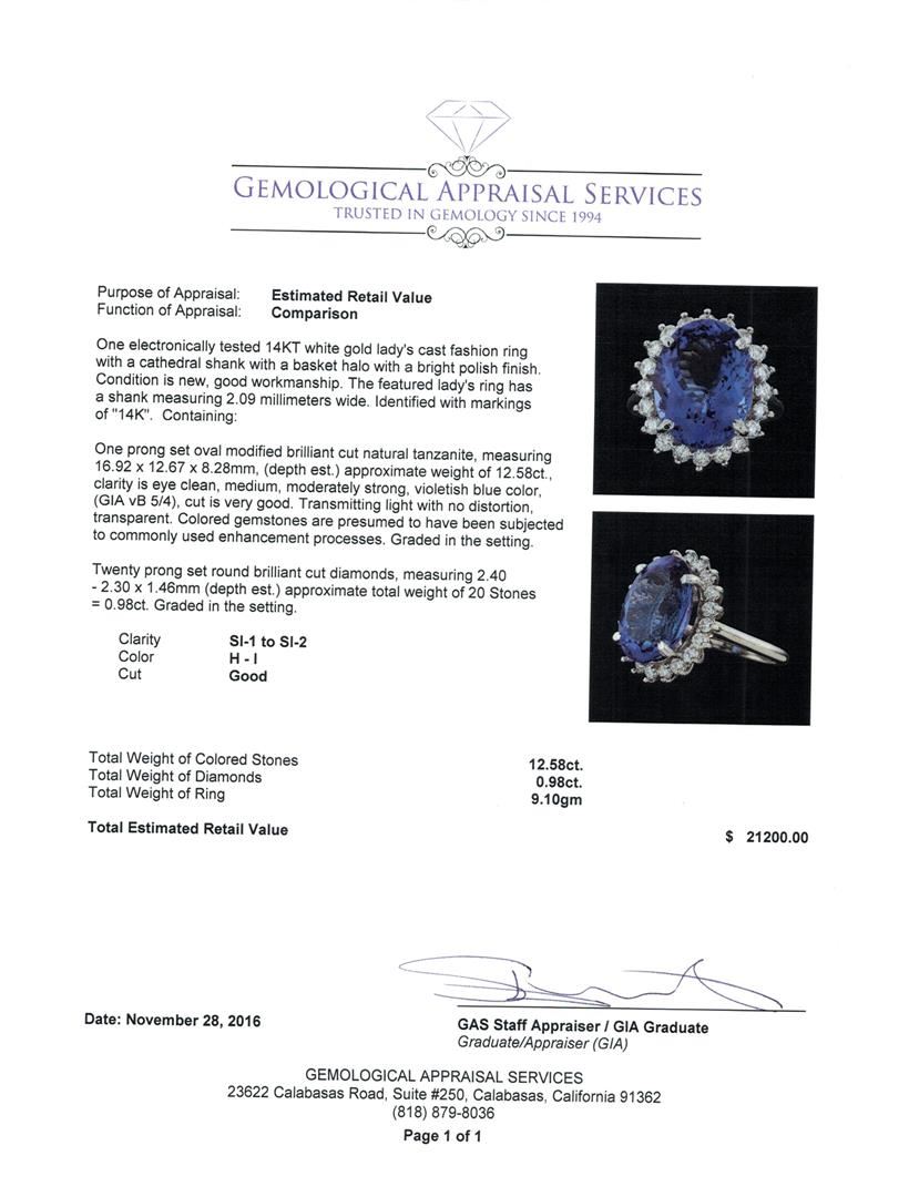 One electronically tested 14KT white gold lady's cast fashion ring with a cathedral shank with a basket halo with a bright polish finish. The featured lady's ring has a shank measuring 2.09 millimeters wide. Identified with markings of '14K'. Condition is new, good workmanship. Containing: One prong set oval modified brilliant cut natural tanzanite, measuring 16.92 x 12.67 x 8.28mm, (depth est.) approximate weight of 12.58ct., clarity is eye clean, medium, moderately strong, violetish blue color, (GIA vB 5/4), cut is very good. Transmitting light with no distortion, transparent. Colored gemstones are presumed to have been subjected to commonly used enhancement processes. Graded in the setting. Twenty prong set round brilliant cut diamonds, measuring 2.40 - 2.30 x 1.46mm (depth est.) approximate total weight of 20 Stones = 0.98ct. Graded in the setting. Clarity SI-1 to SI-2. Color: H - I Cut Good. Total Weight of Colored Stones 12.58ct.. Total Weight of Diamonds 0.98ct.. Total Weight of Ring 9.10gm. GAS Appraised at $21,200.00.