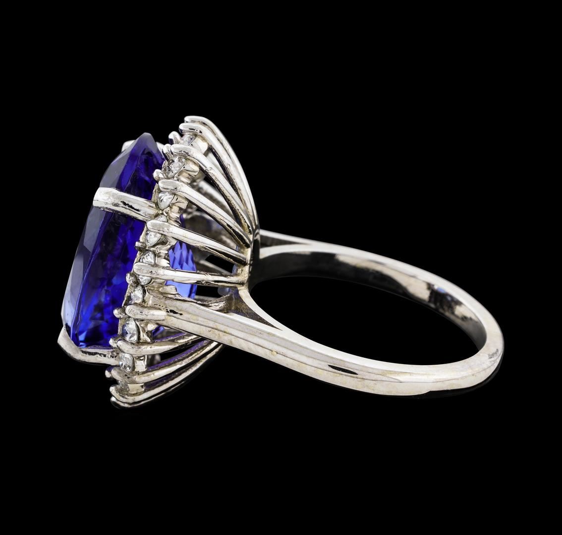 One electronically tested 14KT white gold lady's cast fashion ring with a cathedral shank with a basket halo with a bright polish finish. The featured lady's ring has a shank measuring 2.09 millimeters wide. Identified with markings of '14K'. Condition is new, good workmanship. Containing: One prong set oval modified brilliant cut natural tanzanite, measuring 16.92 x 12.67 x 8.28mm, (depth est.) approximate weight of 12.58ct., clarity is eye clean, medium, moderately strong, violetish blue color, (GIA vB 5/4), cut is very good. Transmitting light with no distortion, transparent. Colored gemstones are presumed to have been subjected to commonly used enhancement processes. Graded in the setting. Twenty prong set round brilliant cut diamonds, measuring 2.40 - 2.30 x 1.46mm (depth est.) approximate total weight of 20 Stones = 0.98ct. Graded in the setting. Clarity SI-1 to SI-2. Color: H - I Cut Good. Total Weight of Colored Stones 12.58ct.. Total Weight of Diamonds 0.98ct.. Total Weight of Ring 9.10gm. GAS Appraised at $21,200.00.
