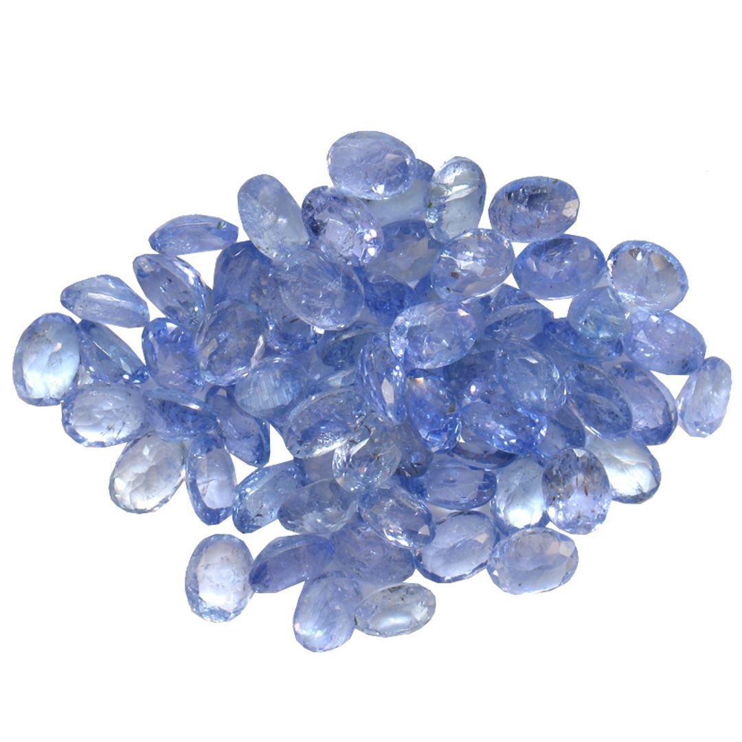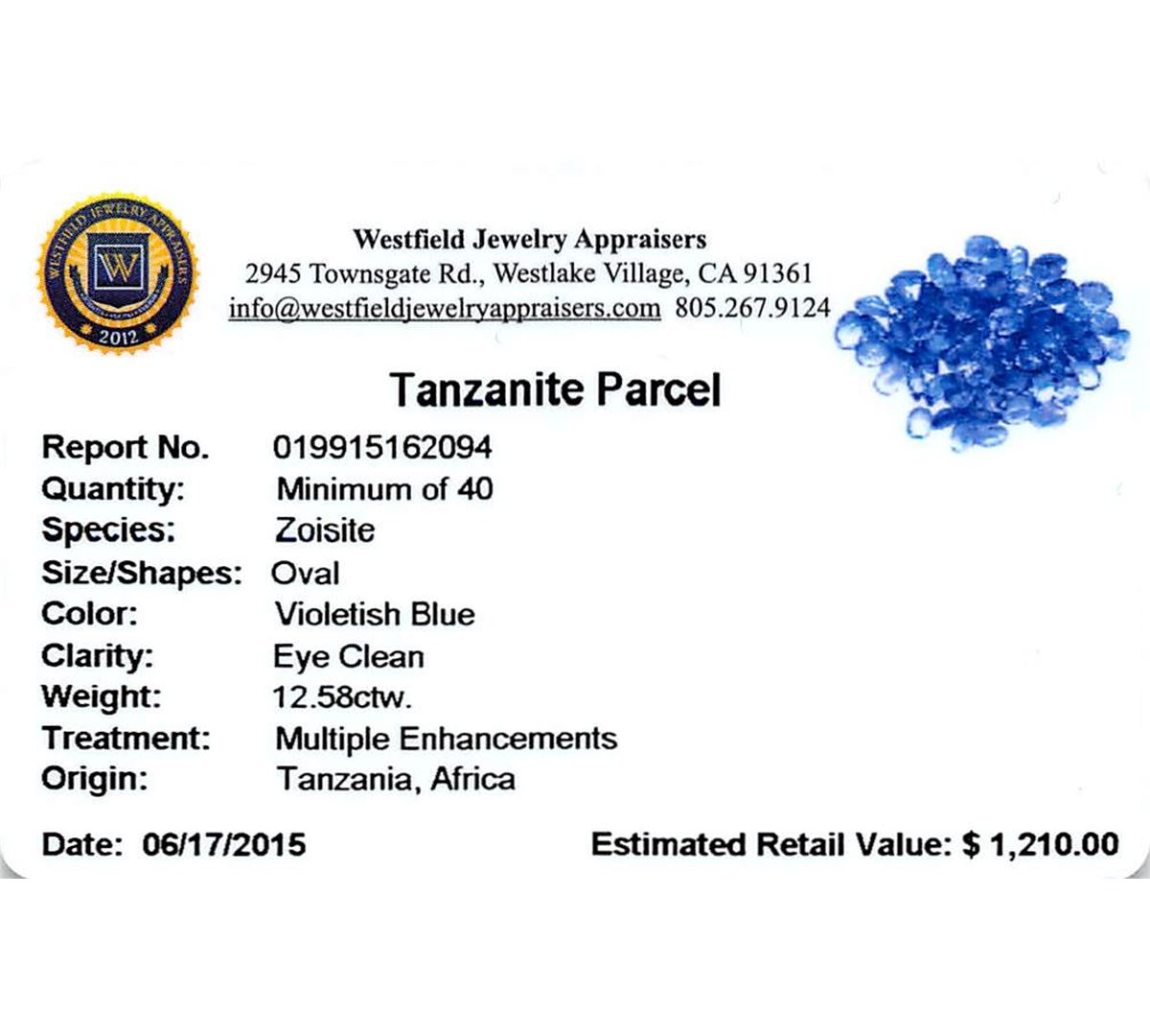 Forty oval mixed cut natural tanzanites exact total weight 12.58ct., clarity is slightly included, type I, medium dark, very slightly grayish, violetish blue color, (GIA vB 6/3), cut is good. Measurements & the color grade are an average for the group, Color grade is an average for the group, Transmitting light with no distortion, transparent, Indications of laboratory high temperature heat treatment. Westfield Appraised at $1,210.00.
