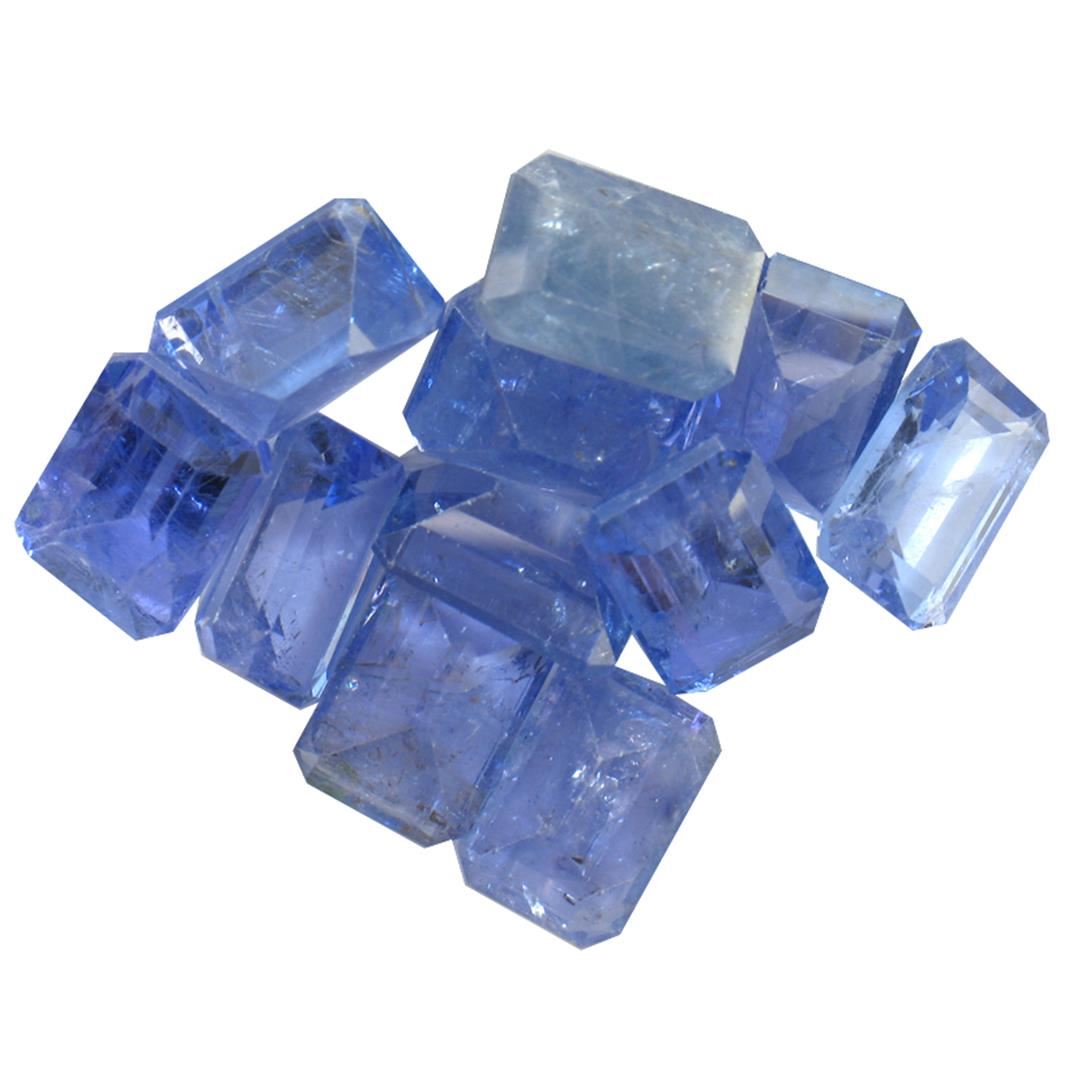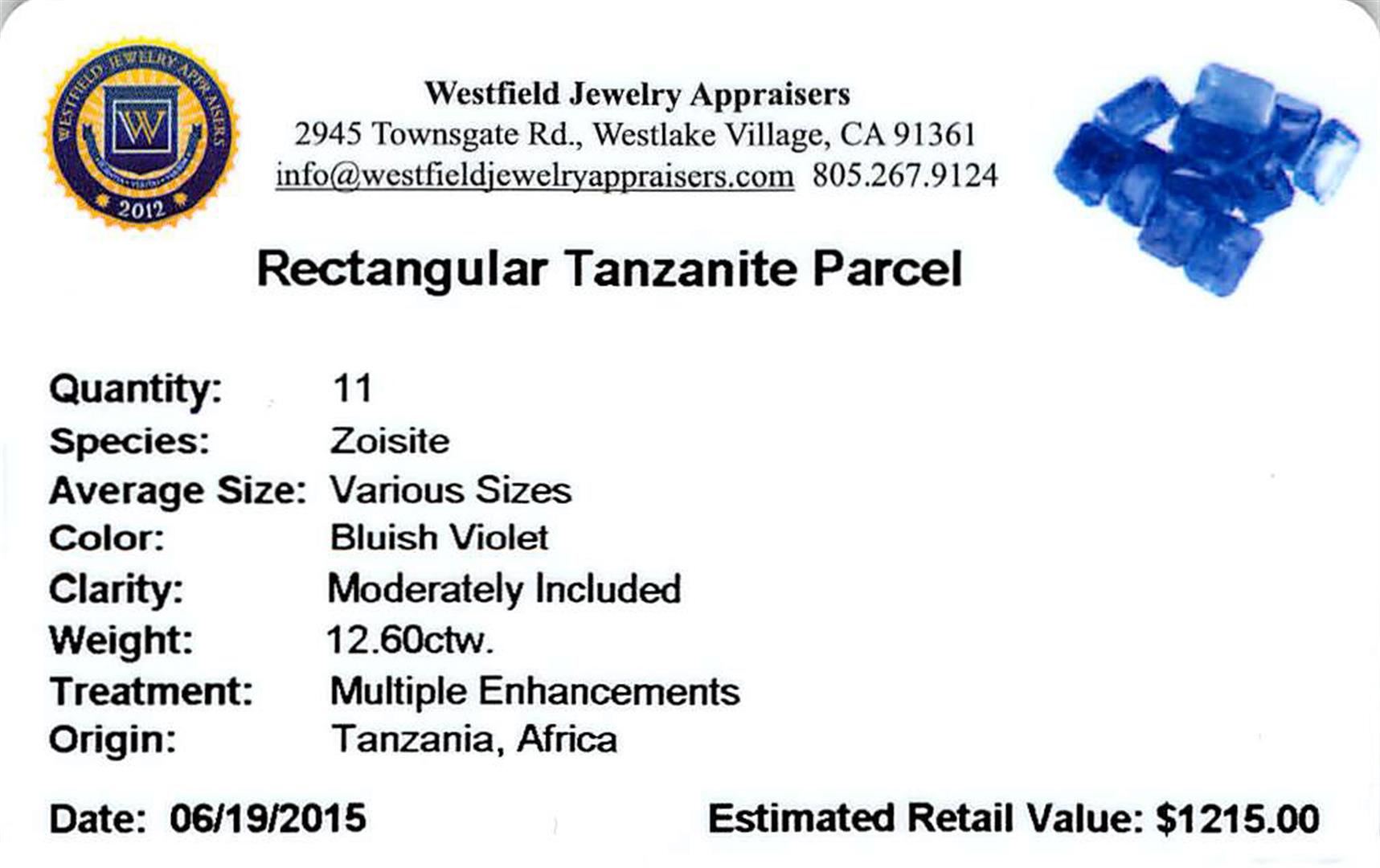Eleven rectangular step cut natural tanzanites exact total weight 12.60ct., clarity is moderately included, type I, medium dark, very slightly grayish, bluish violet color, (GIA bV 6/3), cut is good. Transmitting light with a minimum of distortion, transparent. Naturally occurring internal & external characteristics are present. Color grade is an average for the group. Tanzanite is a very rare gemstone that is only found in the country of Tanzania. Originally discovered in 1967. Tiffany & Company, named the stone Tanzanite. It is found in the Usumburu Mountains that border the Umba Valley of northern Tanzania. Tanzanite occurs in gray, brown, violet, blue, reddish-purple, & green. The gem is interesting because of its exceptional pleochroism. Rotated in different directions a tanzanite will exhibit multiple changes of color. Tanzanite has a low tolerance to ultrasonic cleaning, and should not be cleaned using this method. Westfield Appraised at $1,215.00.