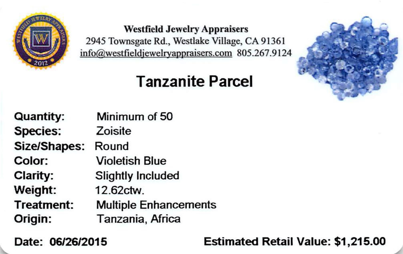 Fifty round mixed cut natural tanzanites, measuring 2.00 - 2.00 x 1.30 mm, exact total weight 12.62ct., clarity is slightly included, type I, medium, very slightly grayish, violetish blue color, (GIA vB 5/3), cut is good. Measurements & the color grade are an average for the group, Color grade is an average for the group, Transmitting light with no distortion, transparent, Naturally occurring internal & external characteristics are present, Indications of multiple laboratory enhancements, including high temperature heat treatment. Westfield Appraised at $1,215.00.