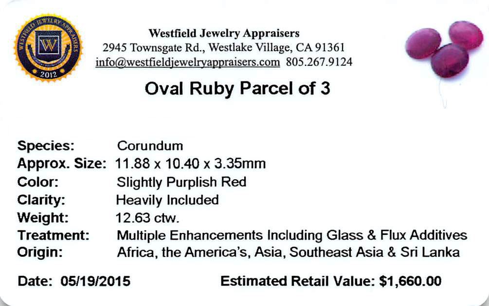 Three oval mixed cut natural rubies, measuring 11.88 x 10.40 x 3.35mm, exact total weight 12.63ct., clarity is heavily included, type II, dark, very slightly brownish, slightly purplish red color, (GIA slpR 7/3), cut is good. Transmitting light somewhat diffusely, transparent to translucent. Naturally occurring internal & external characteristics are present. Indications of laboratory high temperature heat treatment, with glass & flux additives. Ruby has a low tolerance to rhodium plating, repolishing the surface, & ultrasonic cleaning. Westfield Appraised at $1,660.00.