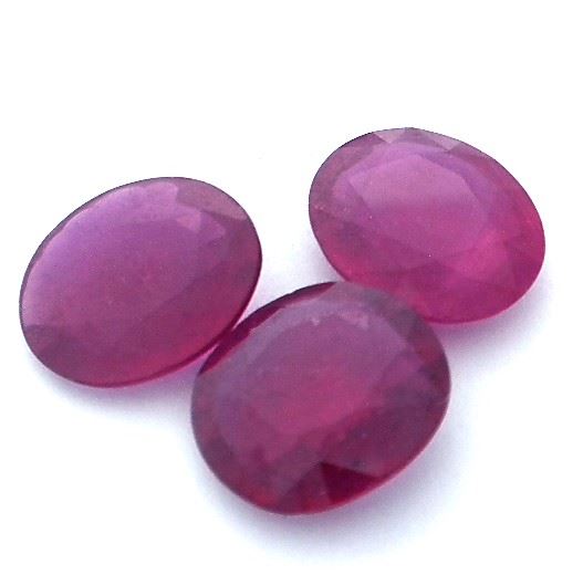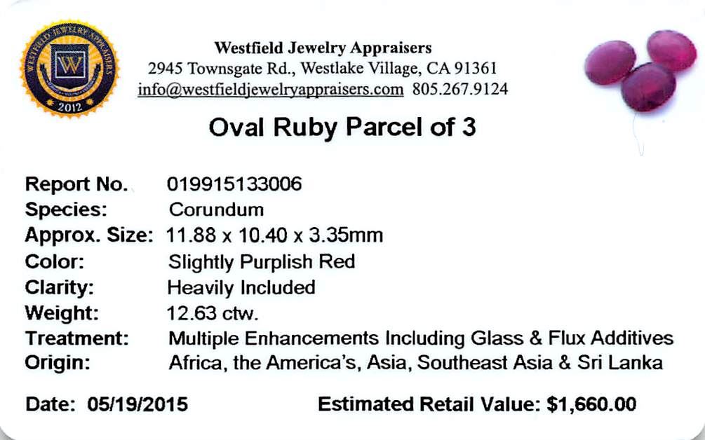 Three oval mixed cut natural rubies, measuring 11.88 x 10.40 x 3.35mm, exact total weight 12.63ct., clarity is heavily included, type II, dark, very slightly brownish, slightly purplish red color, (GIA slpR 7/3), cut is good. Transmitting light somewhat diffusely, transparent to translucent. Naturally occurring internal & external characteristics are present. Indications of laboratory high temperature heat treatment, with glass & flux additives. Ruby has a low tolerance to rhodium plating, repolishing the surface, & ultrasonic cleaning. Westfield Appraised at $1,660.00.