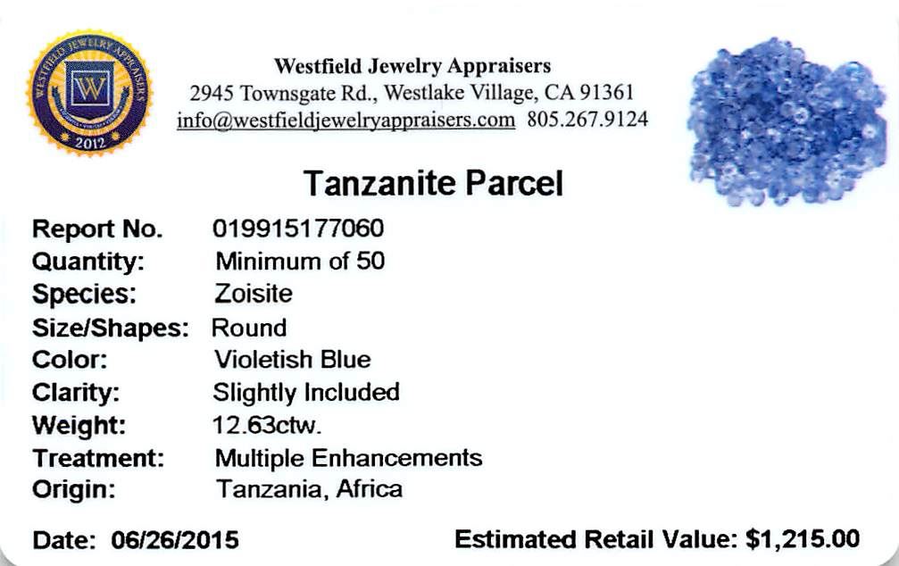 Fifty round mixed cut natural tanzanites, measuring 2.00 - 2.00 x 1.30 mm, exact total weight 12.63ct., clarity is slightly included, type I, medium, very slightly grayish, violetish blue color, (GIA vB 5/3), cut is good. Measurements & the color grad Westfield Appraised at $1,215.00.