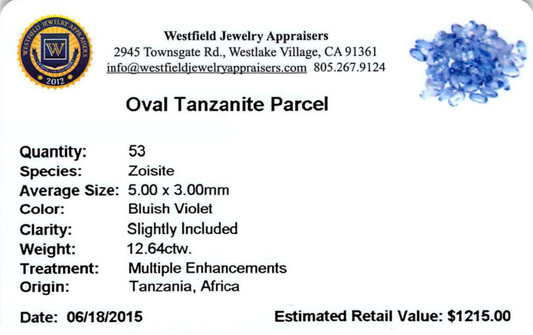 Fifty-three oval mixed cut natural tanzanites, measuring 5.00 x 3.00 x 1.95mm, exact total weight 12.64ct., clarity is slightly included, type I, medium, very slightly grayish, bluish violet color, (GIA bV 5/3), cut is good. Transmitting light with a minimum of distortion, transparent. Naturally occurring internal & external characteristics are present. Measurements & the color grade are an average for the group. Tanzanite is a very rare gemstone that is only found in the country of Tanzania. Originally discovered in 1967. Tiffany & Company, named the stone Tanzanite. It is found in the Usumburu Mountains that border the Umba Valley of northern Tanzania. Tanzanite occurs in gray, brown, violet, blue, reddish-purple, & green. The gem is interesting because of its exceptional pleochroism. Rotated in different directions a tanzanite will exhibit multiple changes of color. Tanzanite has a low tolerance to ultrasonic cleaning, and should not be cleaned using this method. Westfield Appraised at $1,215.00.