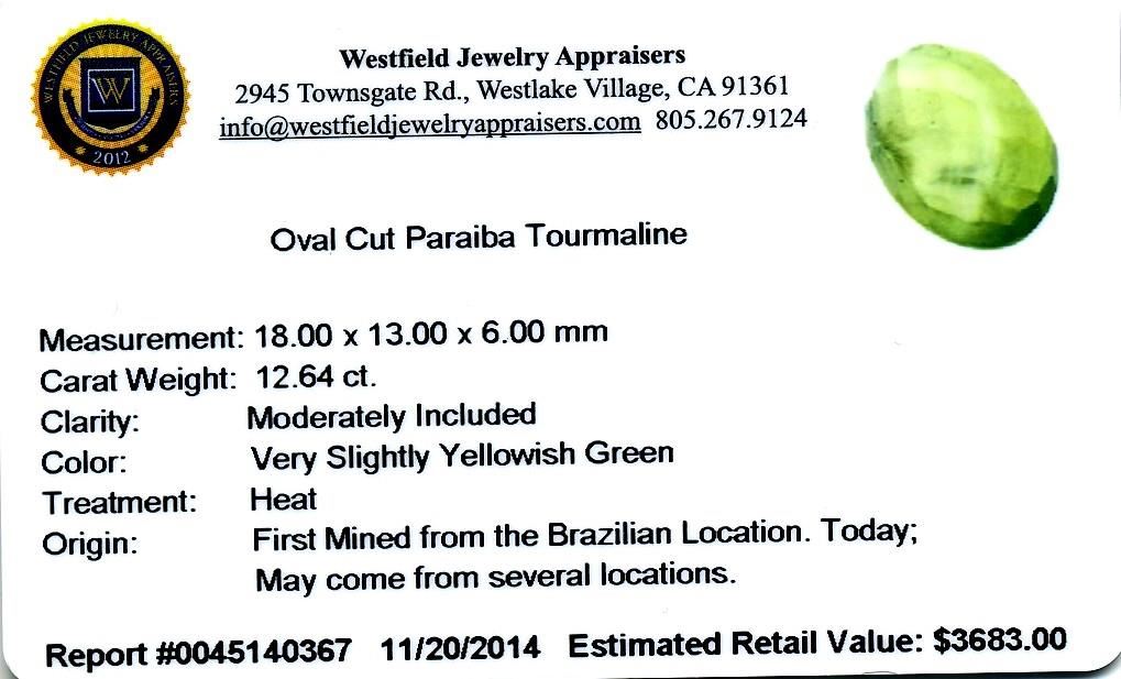 12.64ctw. Oval Cut Paraiba Tourmaline. Westfield Appraised at $3,683.00.