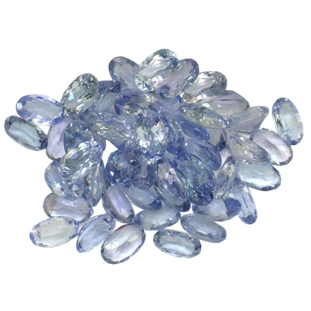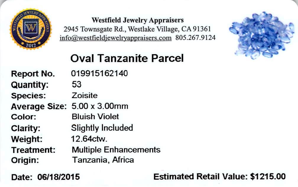 Fifty-three oval mixed cut natural tanzanites, measuring 5.00 x 3.00 x 1.95mm, exact total weight 12.64ct., clarity is slightly included, type I, medium, very slightly grayish, bluish violet color, (GIA bV 5/3), cut is good. Transmitting light with a Westfield Appraised at $1,215.00.