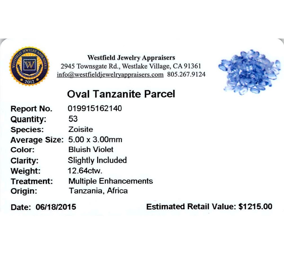 Fifty-three oval mixed cut natural tanzanites, measuring 5.00 x 3.00 x 1.95mm, exact total weight 12.64ct., clarity is slightly included, type I, medium, very slightly grayish, bluish violet color, (GIA bV 5/3), cut is good. Transmitting light with a minimum of distortion, transparent. Naturally occurring internal & external characteristics are present. Measurements & the color grade are an average for the group. Tanzanite is a very rare gemstone that is only found in the country of Tanzania. Originally discovered in 1967. Tiffany & Company, named the stone Tanzanite. It is found in the Usumburu Mountains that border the Umba Valley of northern Tanzania. Tanzanite occurs in gray, brown, violet, blue, reddish-purple, & green. The gem is interesting because of its exceptional pleochroism. Rotated in different directions a tanzanite will exhibit multiple changes of color. Tanzanite has a low tolerance to ultrasonic cleaning, and should not be cleaned using this method. Westfield Appraised at $1,215.00.