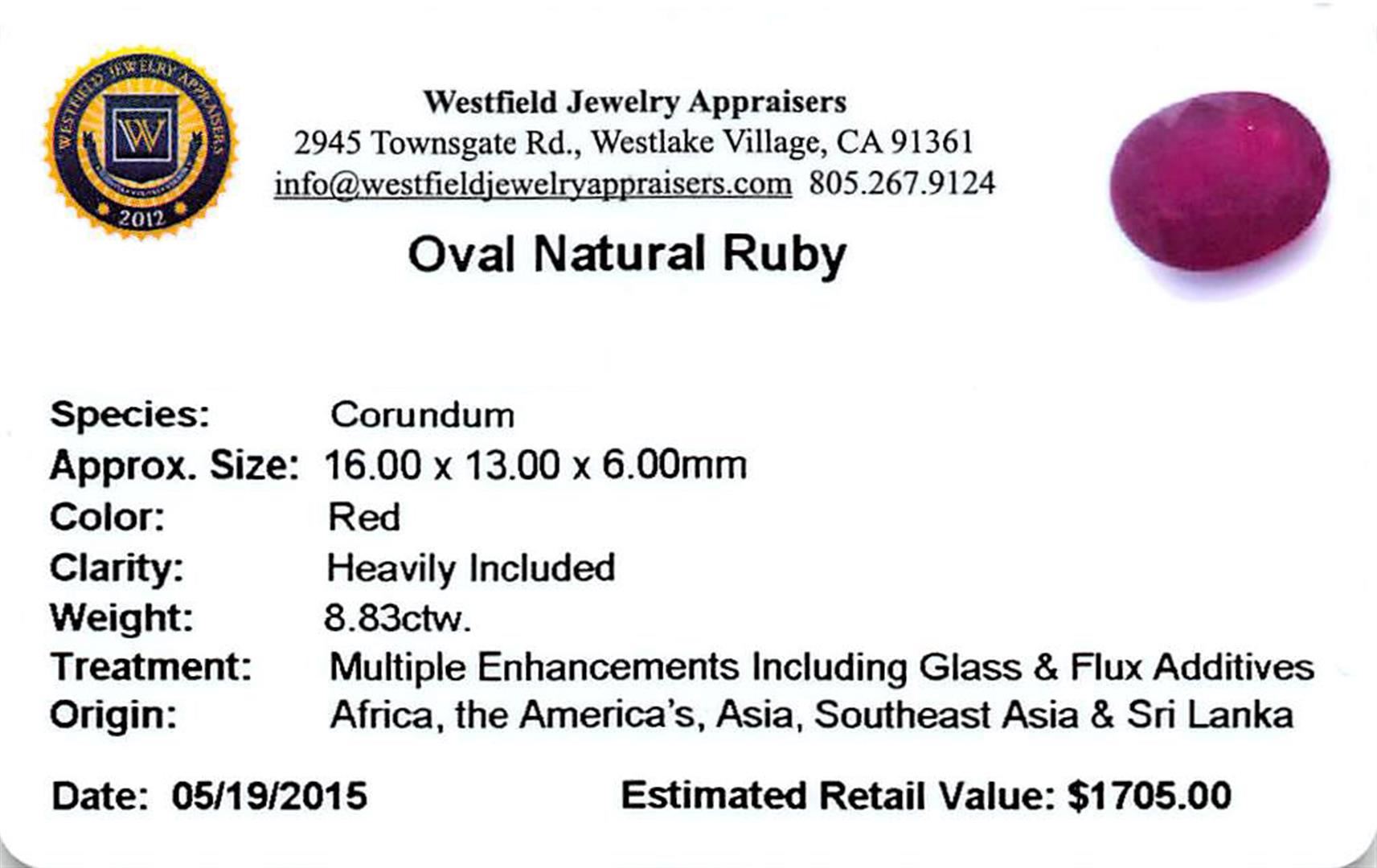 One oval mixed cut natural ruby, measuring 16.00 x 13.00 x 6.00mm, exact weight 12.66ct., clarity is heavily included, type II, medium dark, very slightly brownish, red color, (GIA R 6/3), cut is good. Transmitting light somewhat diffusely, transparent to translucent. Naturally occurring internal & external characteristics are present. Indications of laboratory high temperature heat treatment, with glass & flux additives. Ruby has a low tolerance to rhodium plating, repolishing the surface, & ultrasonic cleaning. Westfield Appraised at $1,705.00.
