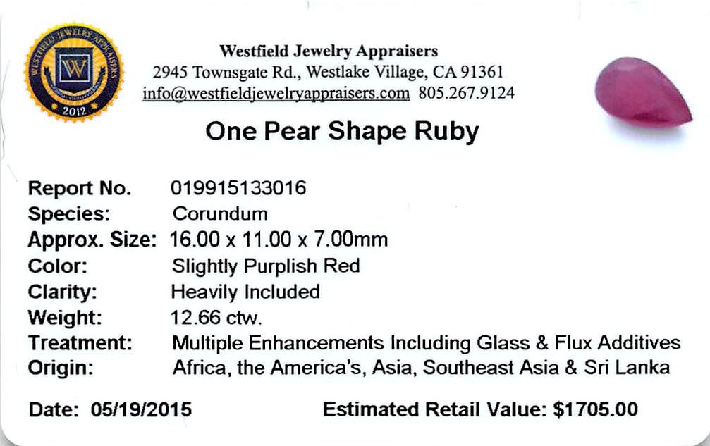 One pear mixed cut natural ruby, measuring 16.00 x 11.00 x 7.00mm, exact weight 12.66ct., clarity is heavily included, type II, medium dark, very slightly brownish, slightly purplish red color, (GIA slpR 6/3), cut is good. Westfield Appraised at $1,705.00.