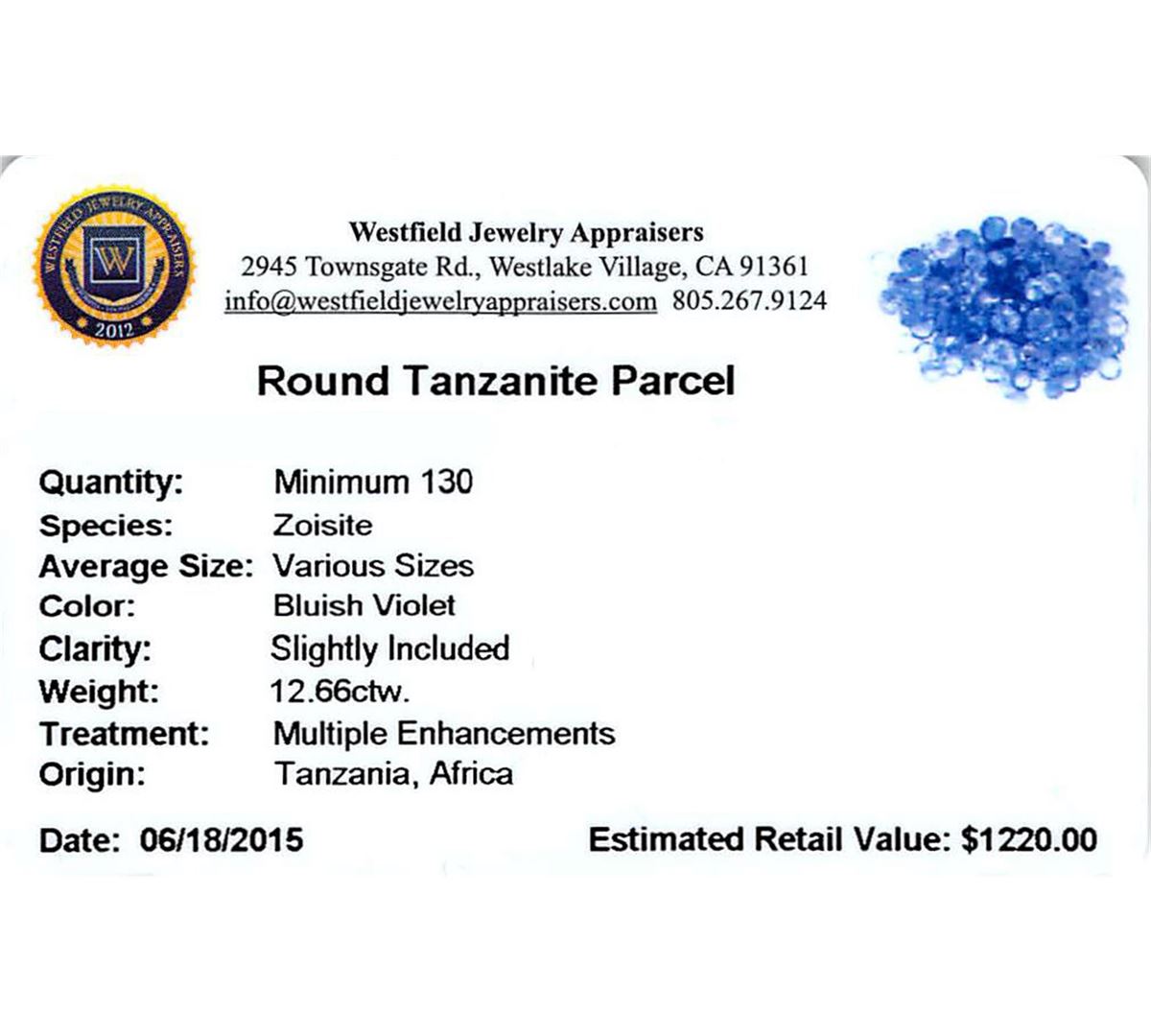 One hundred thirty round mixed cut natural tanzanites exact total weight 12.66ct., clarity is slightly included, type I, medium dark, very slightly grayish, bluish violet color, (GIA bV 6/3), cut is good. Transmitting light with a minimum of distortion, transparent. Naturally occurring internal & external characteristics are present. Color grade is an average for the group. Tanzanite is a very rare gemstone that is only found in the country of Tanzania. Originally discovered in 1967. Tiffany & Company, named the stone Tanzanite. It is found in the Usumburu Mountains that border the Umba Valley of northern Tanzania. Tanzanite occurs in gray, brown, violet, blue, reddish-purple, & green. The gem is interesting because of its exceptional pleochroism. Rotated in different directions a tanzanite will exhibit multiple changes of color. Tanzanite has a low tolerance to ultrasonic cleaning, and should not be cleaned using this method. Westfield Appraised at $1,220.00.