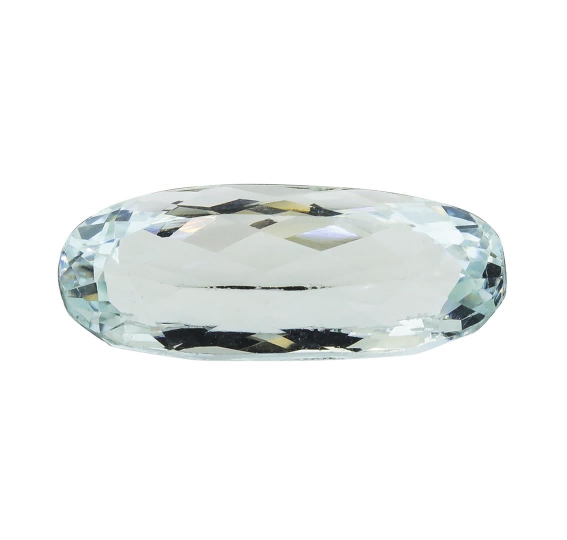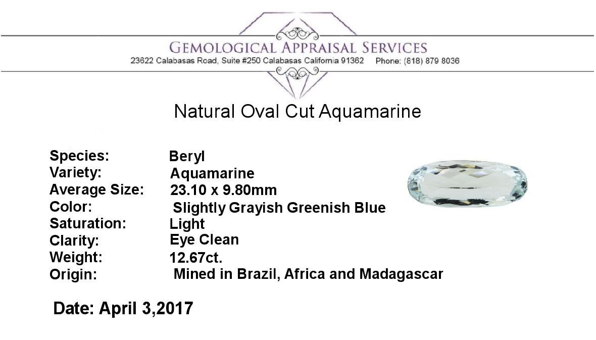 One natural oval cut aquamarine with an exact weight of 12.67ct., clarity is eye clean, slightly grayish greenish blue, light. Gemological Appraisals Services estimates the retail value at $3610.95 GAS Appraised.