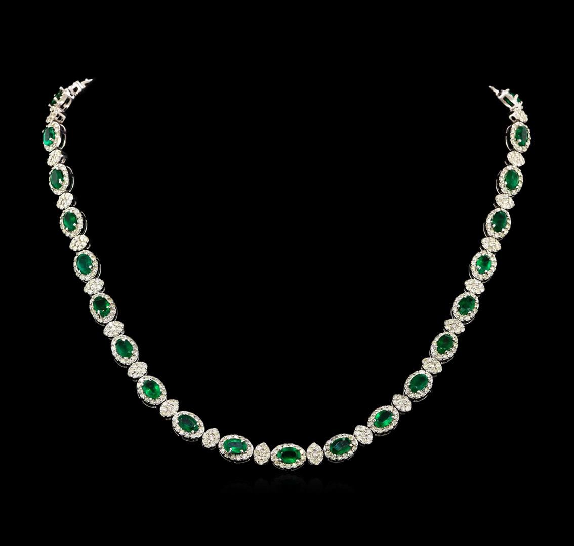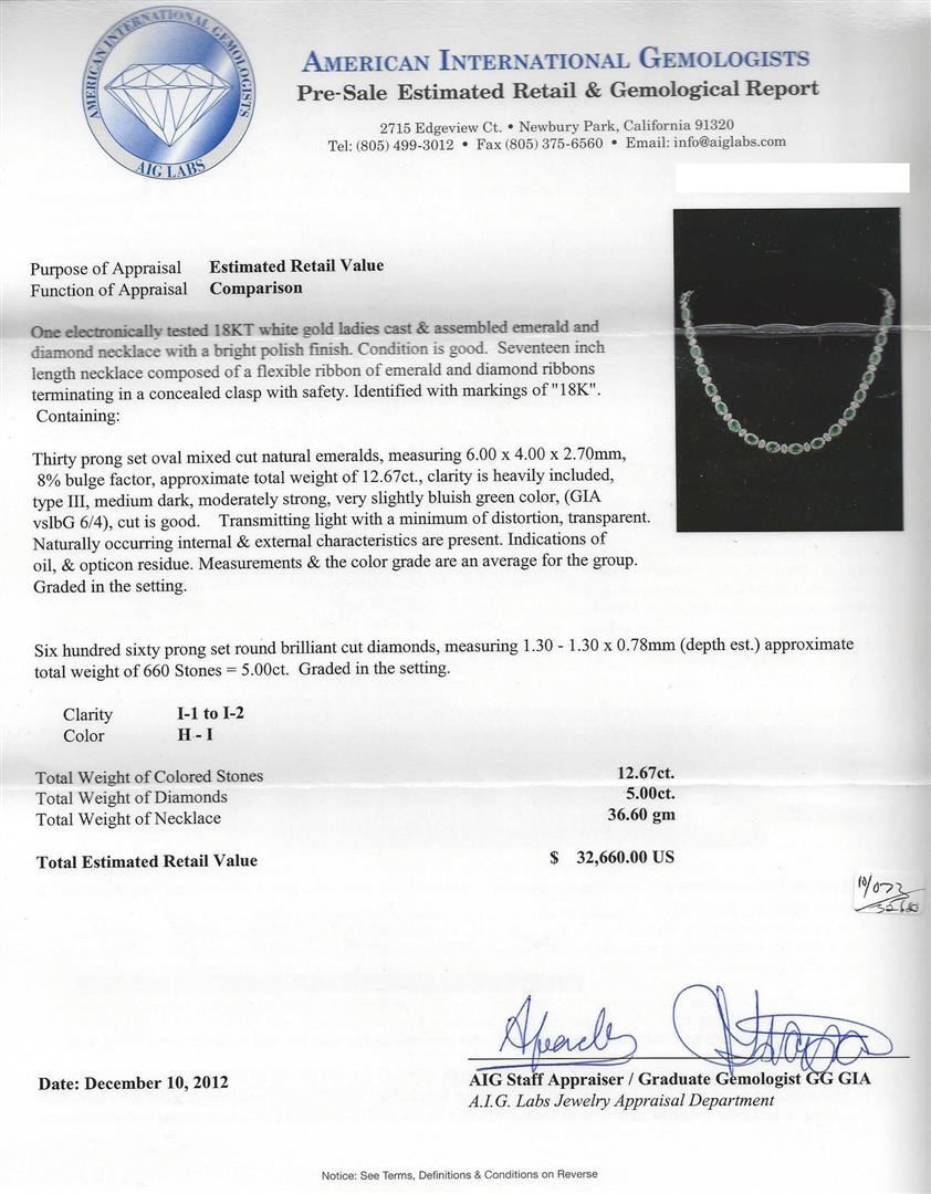 One electronically tested 18KT white gold ladies cast & assembled emerald and diamond necklace with a bright polish finish. Identified with markings of "18K". Condition is good. Containing: Thirty prong set oval mixed cut natural emeralds, measuring 6.00 x 4.00 x 2.70mm, 8%. bulge factor, approximate total weight of 12.67ct., clarity is heavily included, type III, medium dark, moderately strong, very slightly bluish green color, (GIA vslbG 6/4), cut is good. Transmitting light with a minimum of distortion, transparent. Naturally occurring internal & external characteristics are present. Indications of oil, & opticon residue. Measurements & the color grade are an average for the group. Graded in the setting. Six Hundred Sixty prong set round brilliant cut diamonds, measuring 1.30 - 1.30 x 0.78mm (depth est.) approximate total weight of 660 Stones = 5.00ct. Graded in the setting. Clarity: I-1 to I-2. Color: H - I. Total Weight of Colored Stones 12.67ct. Total Weight of Diamonds 5.00ct. AIG Appraised at $32,660.00.
