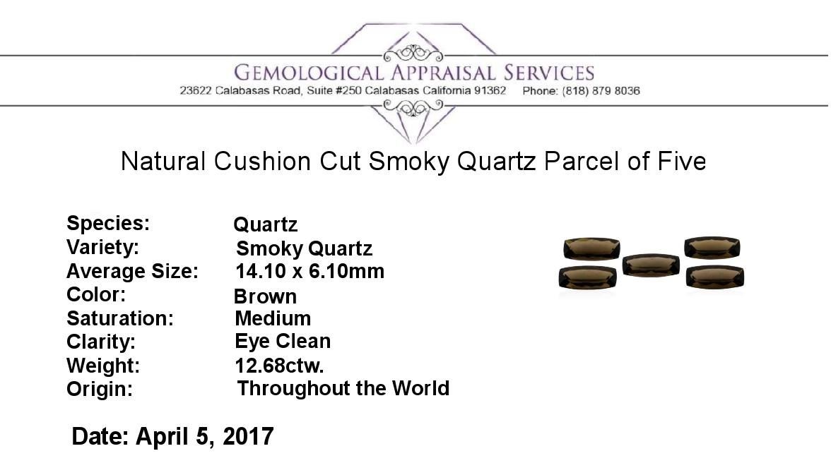 One natural cushion cut smoky quartz parcel of five with an exact weight of 12.68ctw., clarity is eye clean, brown, medium. Gemological Appraisals Services estimates the retail value at $228.24 GAS Appraised.