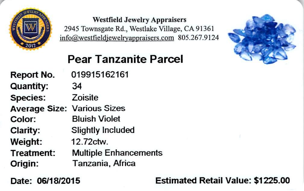 Thirty-four pear mixed cut natural tanzanites exact total weight 12.72ct., clarity is slightly included, type I, medium dark, very slightly grayish, bluish violet color, (GIA bV 6/3), cut is good. Transmitting light with a minimum of distortion, transparent. Naturally occurring internal & external characteristics are present. Color grade is an average for the group. Tanzanite is a very rare gemstone that is only found in the country of Tanzania. Originally discovered in 1967. Tiffany & Company, named the stone Tanzanite. It is found in the Usumburu Mountains that border the Umba Valley of northern Tanzania. Tanzanite occurs in gray, brown, violet, blue, reddish-purple, & green. The gem is interesting because of its exceptional pleochroism. Rotated in different directions a tanzanite will exhibit multiple changes of color. Tanzanite has a low tolerance to ultrasonic cleaning, and should not be cleaned using this method. Westfield Appraised at $1,225.00.