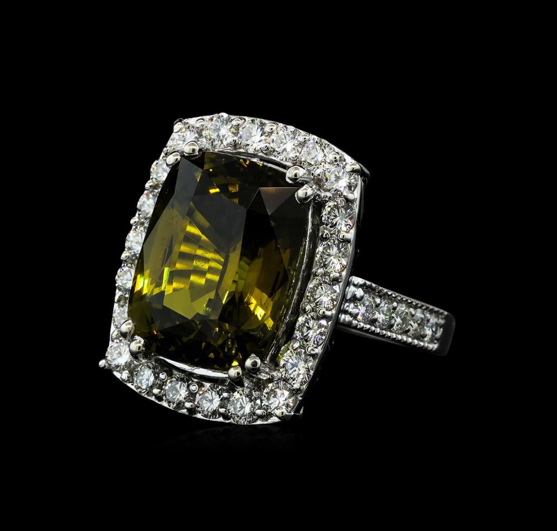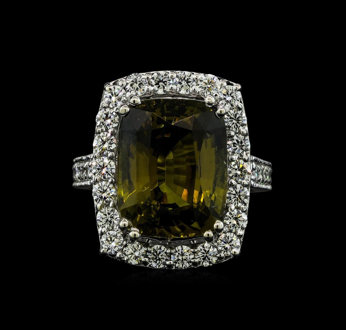 One electronically tested 14KT white gold lady's cast fashion ring with a cathedral shank with a basket halo with a bright polish with milgrain detailing finish. The featured lady's ring has a shank measuring 2.80 millimeters wide. Identified with markings of '14K'. Condition is new, good workmanship. Containing: One prong set rectangular cushion modified mixed cut natural alexandrite, measuring 14.54 x 11.53 x 8.13mm, (depth est.) approximate weight of 12.73ct., clarity is slightly included, cut is very good. The featured alexandrite has a medium dark, moderately strong greenish yellow hue which changes to a medium, moderately strong yellowish brown hue. The stone appears to be African in origin. Transmitting light with no distortion, transparent. Colored gemstones are presumed to have been subjected to commonly used enhancement processes. Graded loose prior to setting in the GIA Laboratory, Report #3215416480. Twenty-Two prong set round brilliant cut diamonds, measuring 2.50 - 2.45 x 1.54mm (depth est.) approximate total weight of 22 Stones = 1.27ct. Graded in the setting. Clarity VS-1 to SI-1. Color: G - H Cut Very Good Ten prong set round brilliant cut diamonds, measuring 2.00 - 1.90 x 1.17mm (depth est.) approximate total weight of 10 Stones = 0.27ct. Graded in the setting. Clarity VS-2 to SI-1. Color: G - H Cut Good. Total Weight of Colored Stones 12.73ct.. Total Weight of Diamonds 1.54ct.. Total Weight of Ring 9.80gm GAS Appraised at $83,750.00.