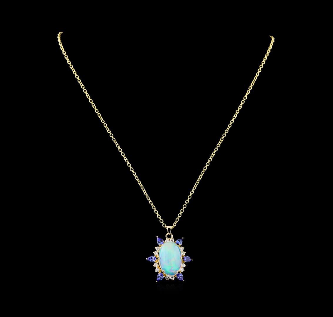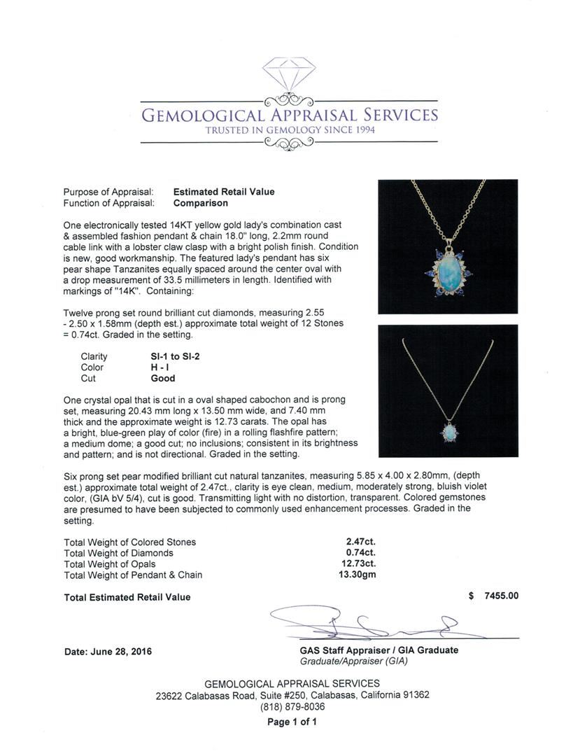 One electronically tested 14KT yellow gold lady's combination cast & assembled fashion pendant & chain 18.0" long, 2.2mm round cable link with a lobster claw clasp with a bright polish finish. The featured lady's pendant has six pear shape Tanzanites equally spaced around the center oval with a drop measurement of 33.5 millimeters in length. Identified with markings of "14K". Condition is new, good workmanship. Containing: Twelve prong set round brilliant cut diamonds, measuring 2.55 - 2.50 x 1.58mm (depth est.) approximate total weight of 12 Stones = 0.74ct. Graded in the setting. Clarity: SI-1 to SI-2. Color: H - I. Cut Good One crystal opal that is cut in a oval shaped cabochon and is prong set, measuring 20.43 mm long x 13.50 mm wide, and 7.40 mm thick and the approximate weight is 12.73 carats. The opal has a bright, blue-green play of color (fire) in a rolling flashfire pattern; a medium dome; a good cut; no inclusions; consistent in its brightness and pattern; and is not directional. Graded in the setting. Six prong set pear modified brilliant cut natural tanzanites, measuring 5.85 x 4.00 x 2.80mm, (depth est.) approximate total weight of 2.47ct., clarity is eye clean, medium, moderately strong, bluish violet color, (GIA bV 5/4), cut is good. Transmitting light with no distortion, transparent. Colored gemstones are presumed to have been subjected to commonly used enhancement processes. Graded in the setting. Total Weight of Colored Stones 2.47ct. Total Weight of Diamonds 0.74ct. Total Weight of Opals 12.73ct. Total Weight of Pendant & Chain 13.30gm. GAS Appraised at $7,455.00.