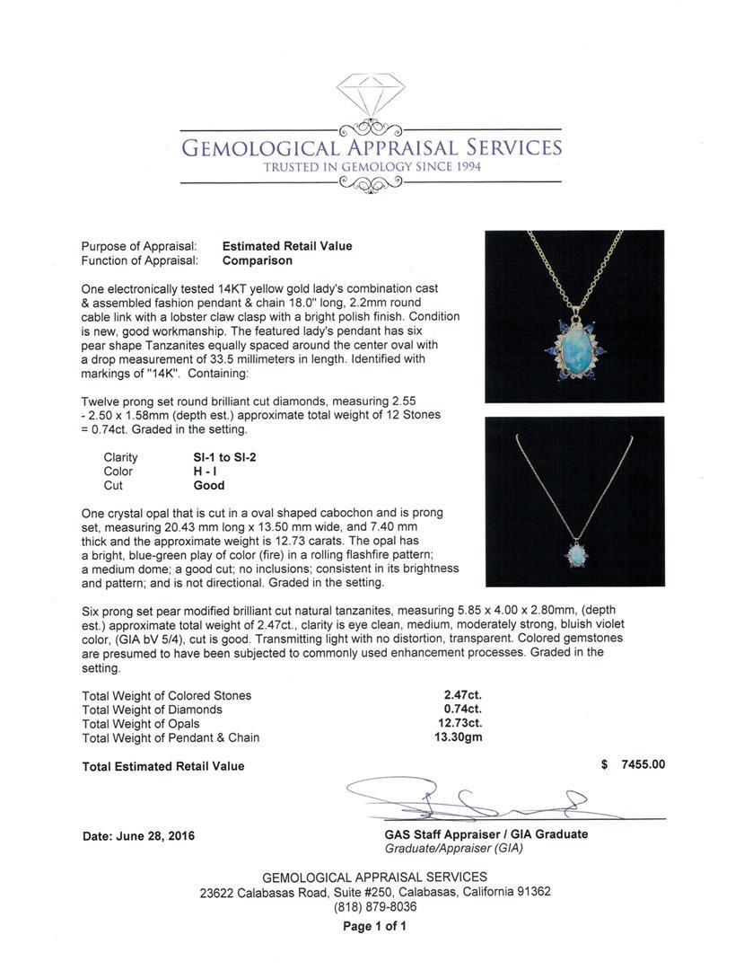 One electronically tested 14KT yellow gold lady's combination cast & assembled fashion pendant & chain 18.0" long, 2.2mm round cable link with a lobster claw clasp with a bright polish finish. The featured lady's pendant has six pear shape Tanzanites equally spaced around the center oval with a drop measurement of 33.5 millimeters in length. Identified with markings of "14K". Condition is new, good workmanship. Containing: Twelve prong set round brilliant cut diamonds, measuring 2.55 - 2.50 x 1.58mm (depth est.) approximate total weight of 12 Stones = 0.74ct. Graded in the setting. Clarity: SI-1 to SI-2. Color: H - I. Cut Good One crystal opal that is cut in a oval shaped cabochon and is prong set, measuring 20.43 mm long x 13.50 mm wide, and 7.40 mm thick and the approximate weight is 12.73 carats. The opal has a bright, blue-green play of color (fire) in a rolling flashfire pattern; a medium dome; a good cut; no inclusions; consistent in its brightness and pattern; and is not directional. Graded in the setting. Six prong set pear modified brilliant cut natural tanzanites, measuring 5.85 x 4.00 x 2.80mm, (depth est.) approximate total weight of 2.47ct., clarity is eye clean, medium, moderately strong, bluish violet color, (GIA bV 5/4), cut is good. Transmitting light with no distortion, transparent. Colored gemstones are presumed to have been subjected to commonly used enhancement processes. Graded in the setting. Total Weight of Colored Stones 2.47ct. Total Weight of Diamonds 0.74ct. Total Weight of Opals 12.73ct. Total Weight of Pendant & Chain 13.30gm. GAS Appraised.