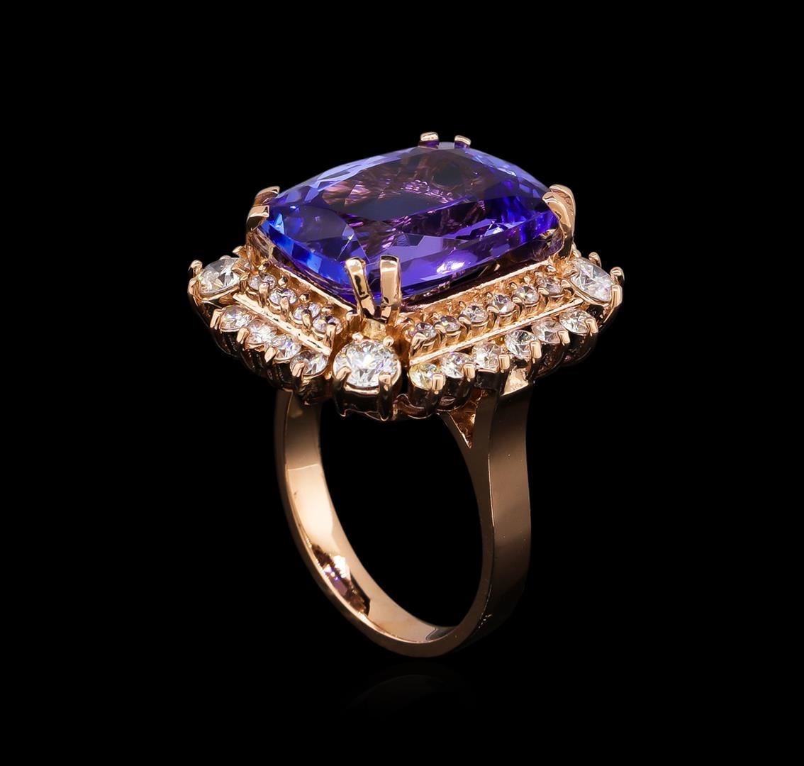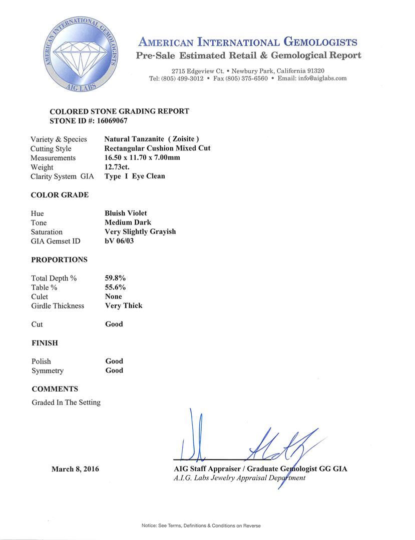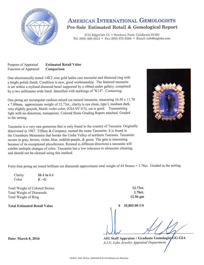 One electronically tested 14KT rose gold ladies cast tanzanite and diamond ring with a bright polish finish. The featured tanzanite is set within a stylized diamond bezel supported by a ribbed under gallery, completed by a two millimeter wide band. Identified with markings of "K14". Condition is new, good workmanship. Containing: One prong set rectangular cushion mixed cut natural tanzanite, measuring 16.50 x 11.70 x 7.00mm, approximate weight of 12.73ct., clarity is eye clean, type I, medium dark, very slightly grayish, bluish violet color, (GIA bV 6/3), cut is good. Transmitting light with no distortion, transparent. Colored Stone Grading Report attached. Graded in the setting. Tanzanite is a very rare gemstone that is only found in the country of Tanzania. Originally discovered in 1967. Tiffany & Company, named the stone Tanzanite. It is found in the Usumburu Mountains that border the Umba Valley of northern Tanzania. Tanzanite occurs in gray, brown, violet, blue, reddish-purple, & green. The gem is interesting because of its exceptional pleochroism. Rotated in different directions a tanzanite will exhibit multiple changes of color. Tanzanite has a low tolerance to ultrasonic cleaning, and should not be cleaned using this method. Forty-Four prong set round brilliant cut diamonds approximate total weight of 44 Stones = 1.76ct. Graded in the setting. Clarity: SI-1 to I-1. Color: E - G. Total Weight of Colored Stones 12.73ct. Total Weight of Diamonds 1.76ct. Total Weight of Ring 12.56gm. AIG Appraised at $35,805.00.