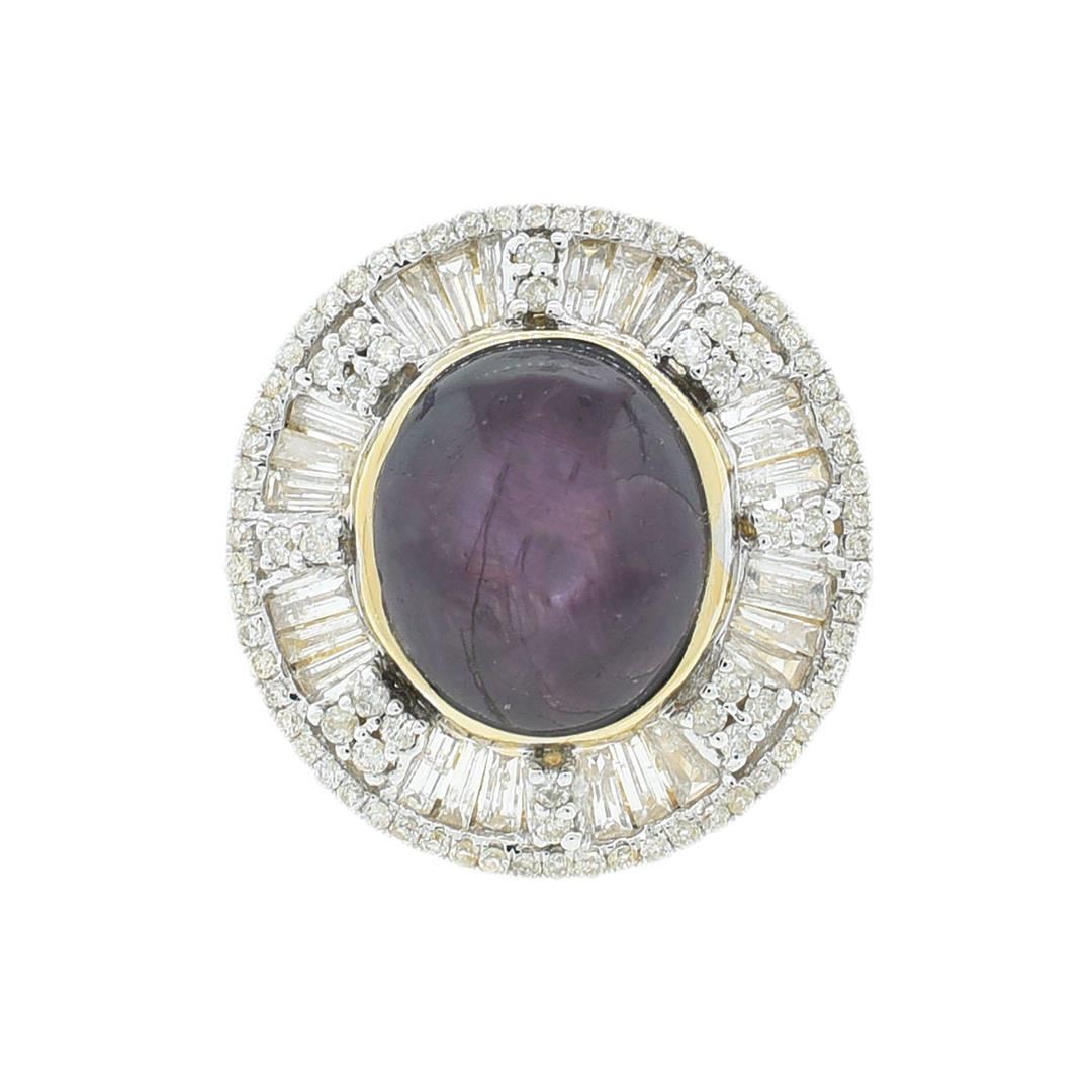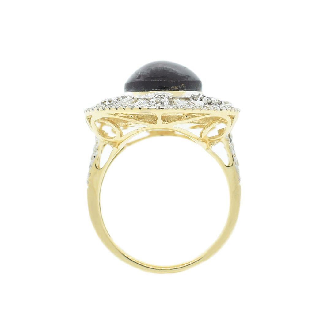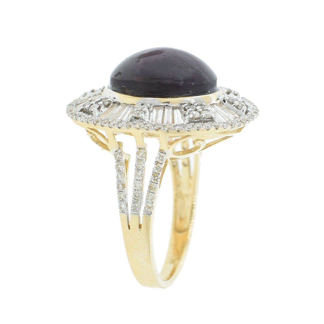 Fourteen karat (14K) yellow gold star ruby and diamond ring. An oval cabochon cut star ruby corundum gemstone is prong mounted in the center of the ring. Baguette and round brilliant cut diamonds accent the ring around and on both sides of the center gemstone. The ring is cast stamped "14K" and has a gross weight of 11.1 Grams. Diamond(s): Shape: Baguette and Round Brilliant Cut Weight: 1.55 carat Average Clarity: SI2-I1 12.13CT. NATURAL UNHEATED Average Color: H-I Symmetry: Very Good STAR RUBY Polish: Very Good Gca:51.one(r..): Gem5to•e: Star Ruby Corundum A --TN. Nature: Natural (Asterism) Shape: Oval, Cabochon Quantity: 1, Mounted Weight: 12.73 carat Dimensions: Length-12.86 mm. Width-10.97 mm. Bulge: Visible Clarity: SI, Type 3 Color: Red (5/5) Symmetry: Very Good Color Intensity: Medium Transparency: Transparent Tone: Dark Comments: No Indications of Heating (Unheated) Metal(s): Metal: Gold, Stamped Purity: 14K Color: Yellow Condition: Excellent Finish: High polish