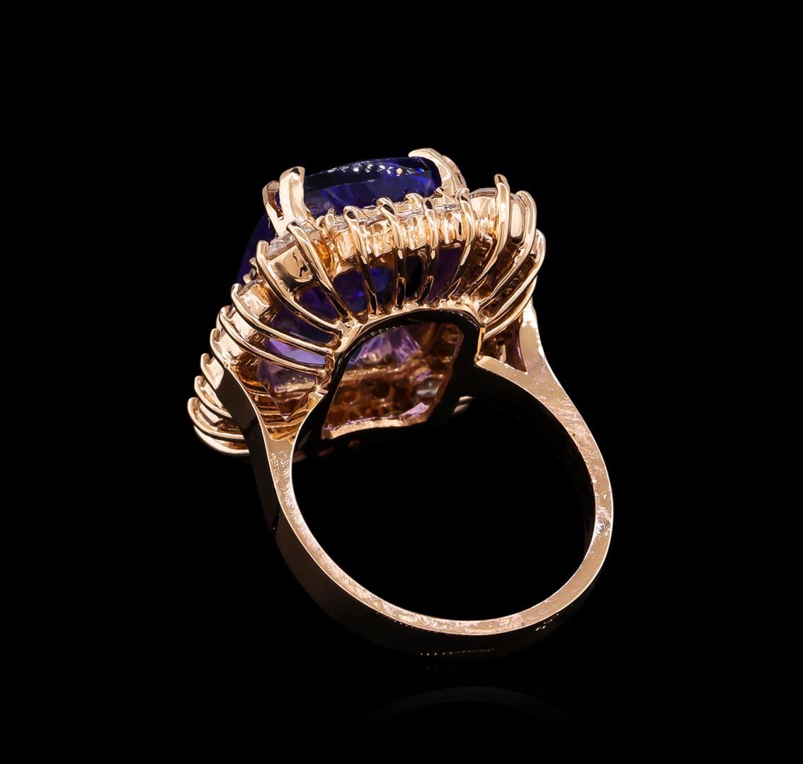 One electronically tested 14KT rose gold ladies cast tanzanite and diamond ring with a bright polish finish. The featured tanzanite is set within a stylized diamond bezel supported by a ribbed under gallery, completed by a two millimeter wide band. Identified with markings of "K14". Condition is new, good workmanship. Containing: One prong set rectangular cushion mixed cut natural tanzanite, measuring 16.50 x 11.70 x 7.00mm, approximate weight of 12.73ct., clarity is eye clean, type I, medium dark, very slightly grayish, bluish violet color, (GIA bV 6/3), cut is good. Transmitting light with no distortion, transparent. Colored Stone Grading Report attached. Graded in the setting. Tanzanite is a very rare gemstone that is only found in the country of Tanzania. Originally discovered in 1967. Tiffany & Company, named the stone Tanzanite. It is found in the Usumburu Mountains that border the Umba Valley of northern Tanzania. Tanzanite occurs in gray, brown, violet, blue, reddish-purple, & green. The gem is interesting because of its exceptional pleochroism. Rotated in different directions a tanzanite will exhibit multiple changes of color. Tanzanite has a low tolerance to ultrasonic cleaning, and should not be cleaned using this method. Forty-Four prong set round brilliant cut diamonds approximate total weight of 44 Stones = 1.76ct. Graded in the setting. Clarity: SI-1 to I-1. Color: E - G. Total Weight of Colored Stones 12.73ct. Total Weight of Diamonds 1.76ct. Total Weight of Ring 12.56gm. AIG Appraised at $35,805.00.