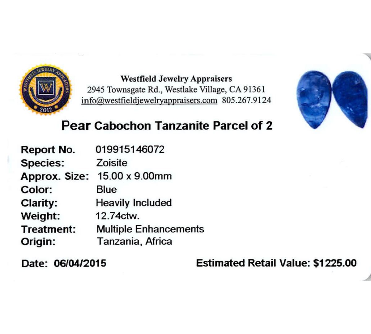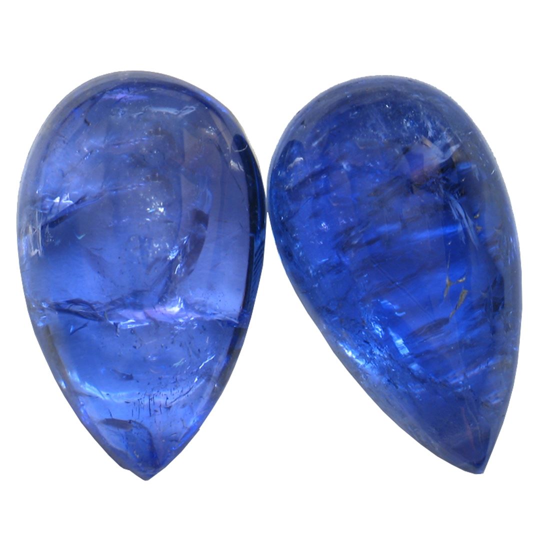 Two pear cabochon cut natural tanzanites, measuring 15.00 x 9.00 x 5.00mm, exact total weight 12.74ct., clarity is heavily included, type I, dark, moderately strong, blue color, (GIA B 7/4), cut is good. Measurements are an average for the pair. Westfield Appraised at $1,225.00.