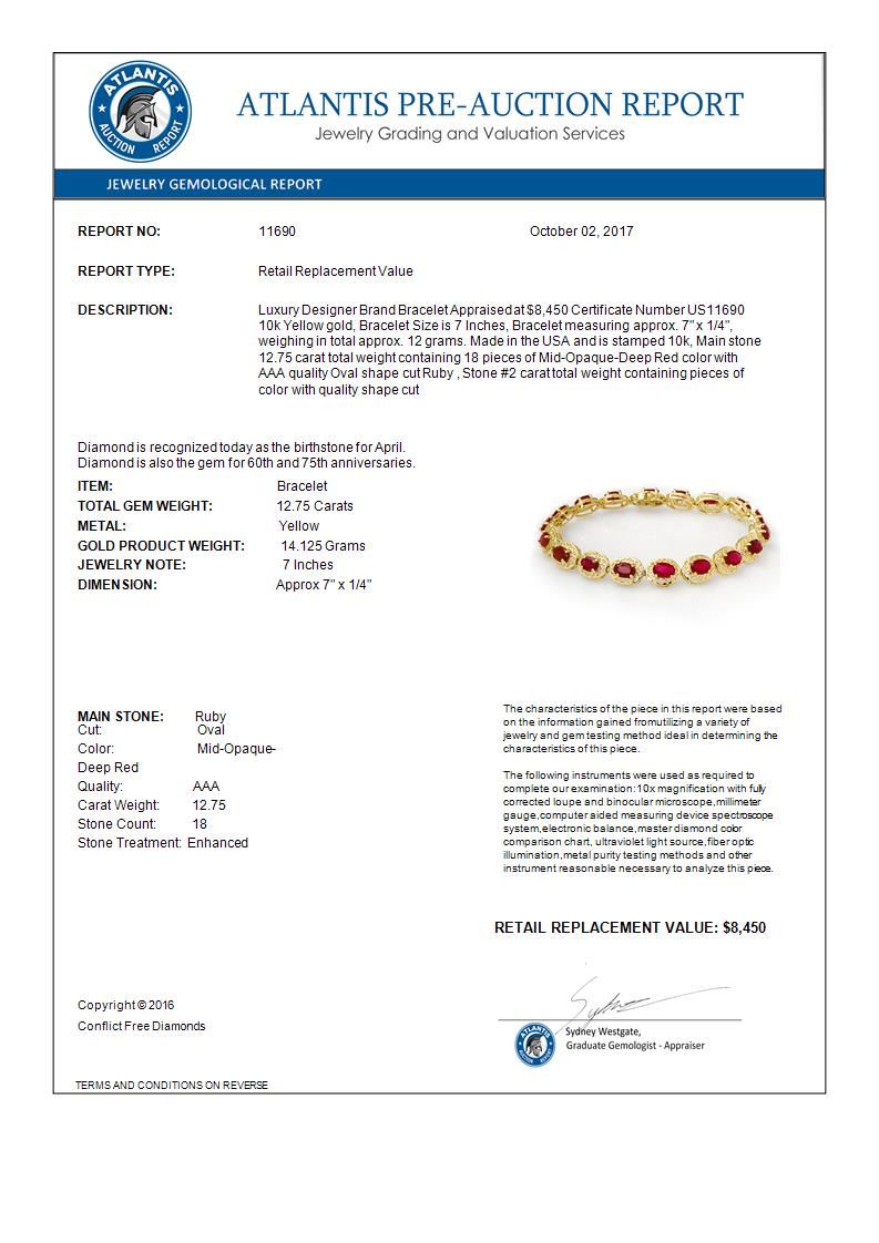 11690 - REF-118X2R ---- 12.75 CTW Ruby Bracelet 10K Yellow Gold ---- Luxury Designer Brand Bracelet Appraised at $8,450 Certificate Number US11690 10k Yellow gold, Bracelet Size is 7 Inches, Bracelet measuring approx. 7" x 1/4", weighing in total approx. 12 grams. Made in the USA and is stamped 10k, Main stone 12.75 carat total weight containing 18 pieces of Mid-Opaque-Deep Red color with AAA quality Oval shape cut Ruby , Stone #2 carat total weight containing pieces of color with quality shape cut