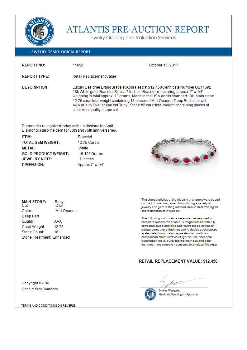 11692 - REF-161M8F ---- 12.75 CTW Ruby Bracelet 18K White Gold ---- Luxury Designer Brand Bracelet Appraised at $12,450 Certificate Number US11692 18k White gold, Bracelet Size is 7 Inches, Bracelet measuring approx. 7" x 1/4", weighing in total approx. 13 grams. Made in the USA and is stamped 18k, Main stone 12.75 carat total weight containing 18 pieces of Mid-Opaque-Deep Red color with AAA quality Oval shape cut Ruby , Stone #2 carat total weight containing pieces of color with quality shape cut